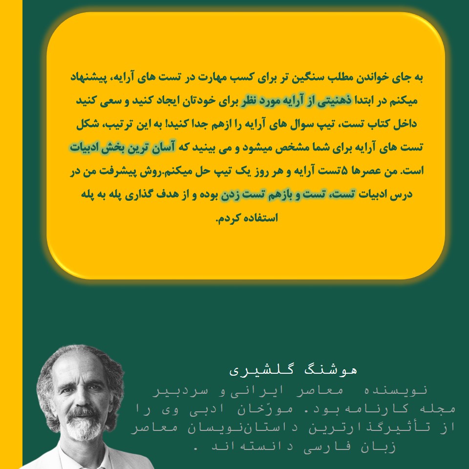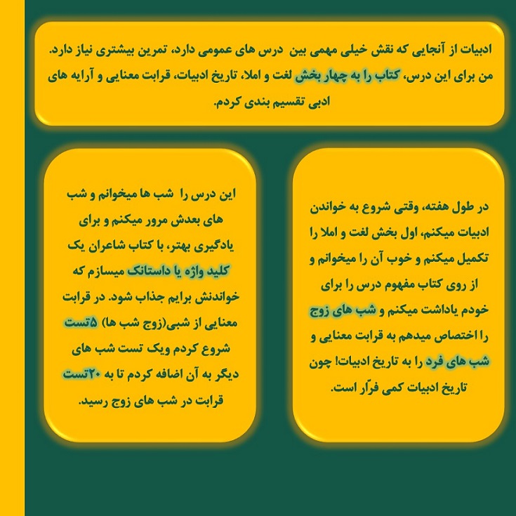 راضیه انصاریان با میانگین درصد 72 در درس ادبیات از لردگان ؛ روش مطالعه خود را (کلکسیون روش مطالعه) در این درس با شما به اشتراک گذاشته است.