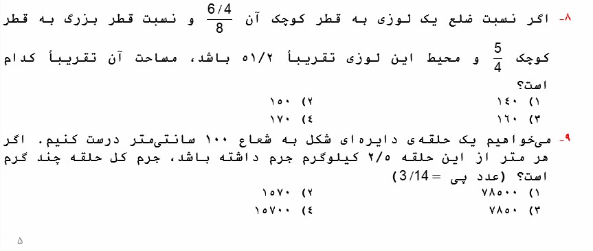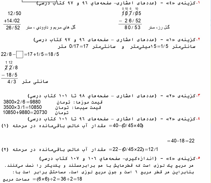 نمونه سوالات ریاضی پنجم دبستان + پاسخ