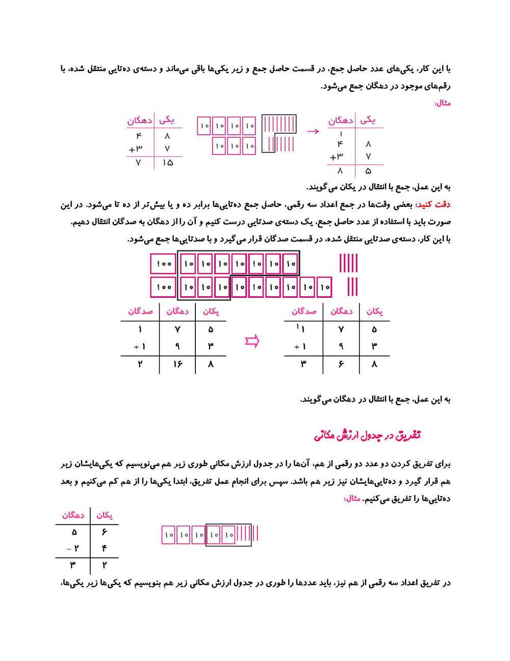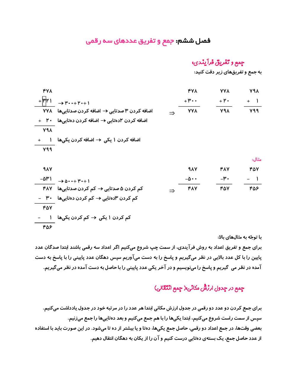در این مجموعه نکات مهم فصل ششم ریاضی دوم دبستان یعنی فصل جمع و تفریق اعداد سه رقمی به همراه مثالهای کاربردی آورده شده است.پی دی اف متنهای بالا در فایل ضمیمه بارگذاری شده است.موفق باشید- خداوردیان