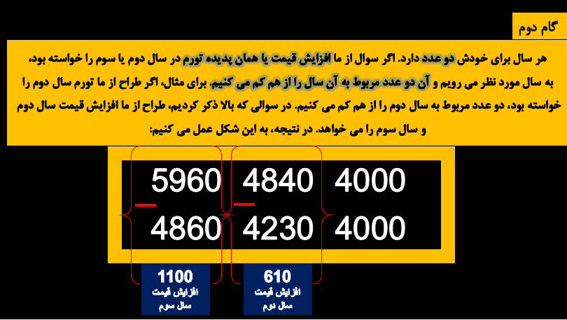 🟠 مثلا طراح در قسمتی از ما افزایش قیمت سال دوم و سوم را بخواهد و در قسمتی دیگر ، مقدار تورم سال سوم و دوم را بخواهد .