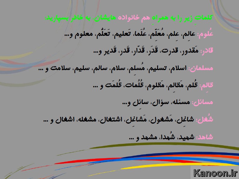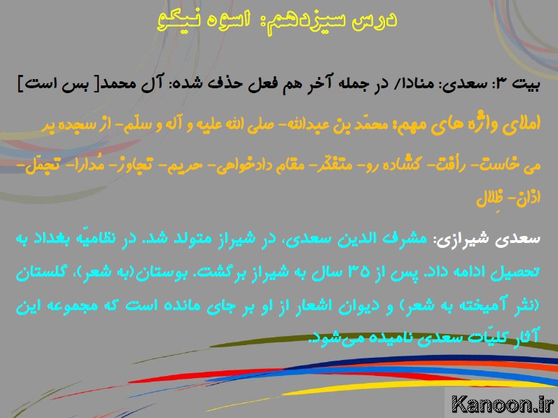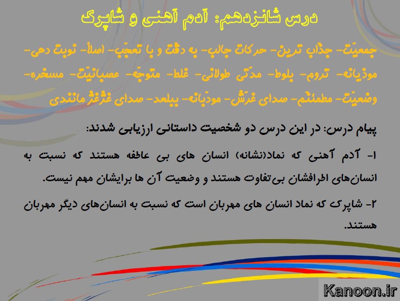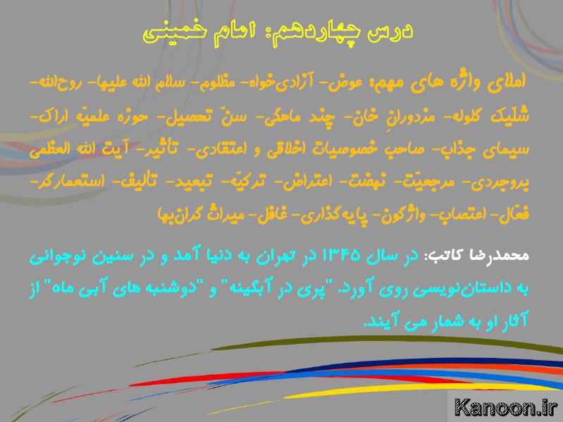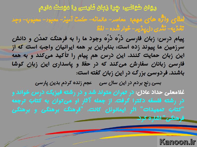 سلام دوستان!امروز قصد داریم دروس "اسوه نیکو"، "امام خمینی"، "آدم آهنی و شاپرک" وروان خوانی "چرا زبان فارسی را دوست دارم" را با هم مرور کنیم. هم چنین دانش زبانی مرتبط با این دروس و واژه های مهم املایی را به همراه اعلام اشخاص فرامی گیریم. موفق باشید