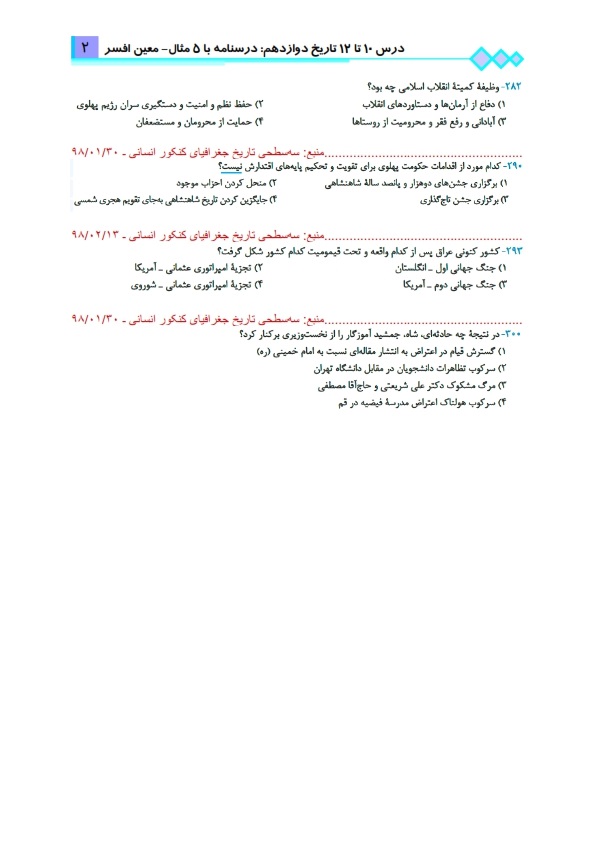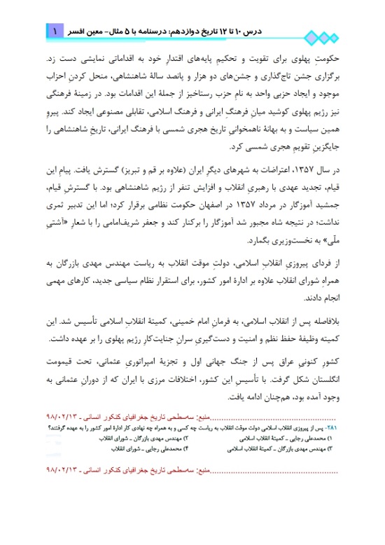 فایل ضمیمه شامل درسنامه با 5 سوال از کتاب سه سطحی تاریخ و جغرافیا، درس 10 تا 12 تاریخ دوازدهم، مطابق با برنامه راهبردی آزمون 17 اردیبهشت می باشد.این مطلب توسط معین افسر تهیه شده است. * گروه پشتیبانان ویژه کانون *
