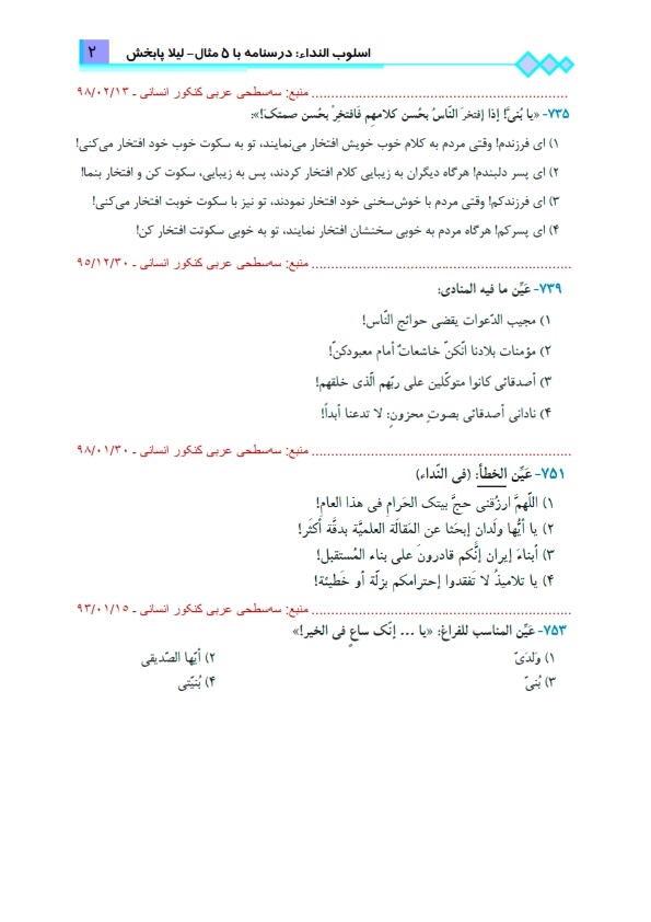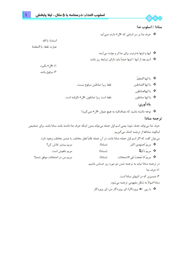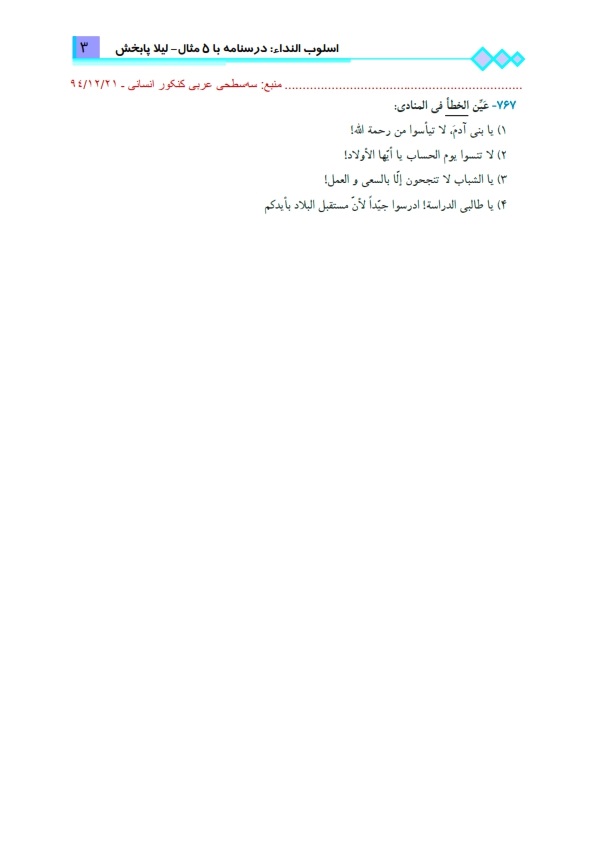 فایل ضمیمه شامل درسنامه با 5 سوال از کتاب سه سطحی عربی (کنکور انسانی)، مبحث اسلوب النداء، مطابق با برنامه راهبردی آزمون 17 اردیبهشت می باشد.این مطلب توسط لیلا پابخش، تهیه شده است. * گروه پشتیبانان ویژه کانون *