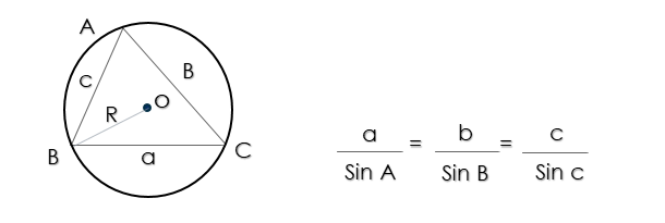 هرمثلث ABC رابطه زیر برقرار است. در این رابطه که به قضیه سینوس ها معروف است، R شعاع دایره محیطی مثلث ABC است.