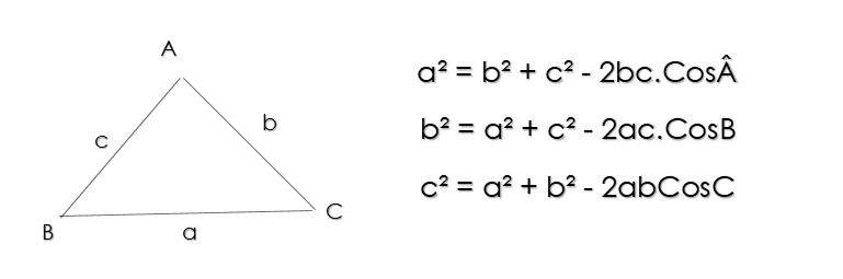 در هر مثلث ، مربع اندازه هر ضلع برابر است با مجموع مربع های اندازه های دوضلع دیگر منهای دو برابر حاصل ضرب اندازه دوضلع در کسینوس زاویه بین آن ها.