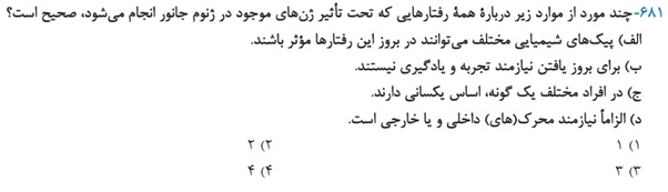 به این عبارت دقت کنید: همه رفتارهایی که تحتتأثیر ژنهای موجود در ژنوم جانور انجام میشود، باید به این نکته دقت کنیم که حتی رفتارهایی هم که بر اثر یادگیری یا تجربه اتفاق میافتند یا اصلاح میشوند، تحت تاثیر ژنها میباشند. بنابراین در این عبارت باید هم به رفتارهای غریزی و هم رفتارهایی که در اثر یادگیری میباشند، توجه کرد.