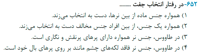 - طاووس ماده از بین طاووسهای نر، طاووس نری را به عنوان جفت انتخاب میکند که رنگ درخشان و لکه های چشم مانند بیشتری روی پرهای دم خود داشته باشد.