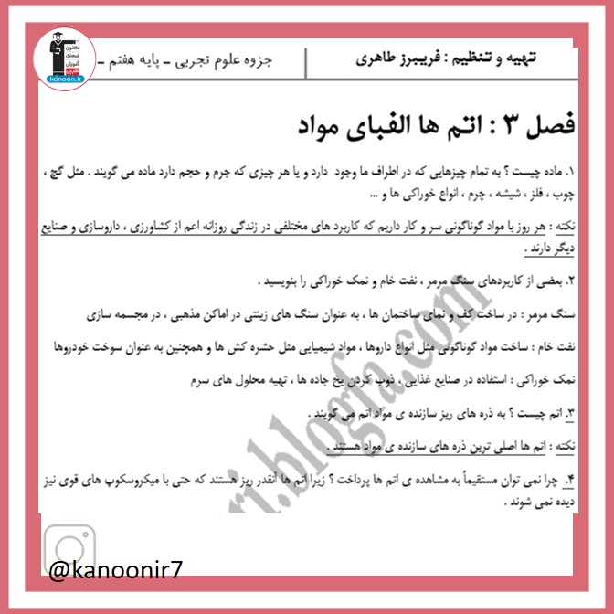دانش آموزان عزیز سلامامیدواریم مثل همیشه حالتان خوب باشد و هر روز بیشتر از دیروز تلاش کرده و به موفقیت نزدیکتر شوید.در ادامه صفحات درسنامه های فصل سوم علوم هفتم را برایتان گذاشته ایم.