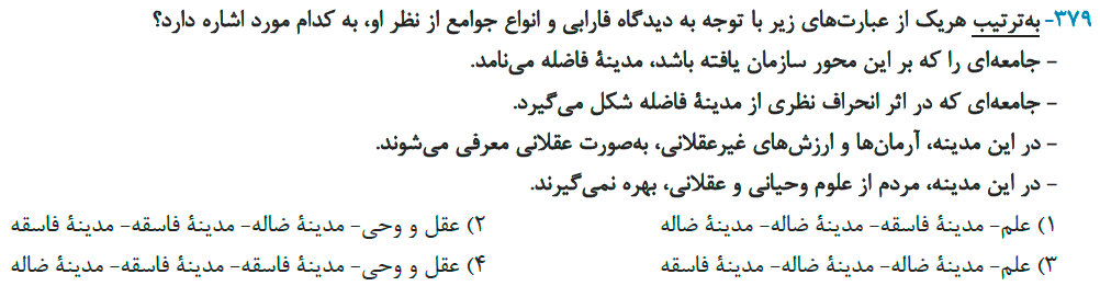 2. مدینۀ فاضله: جامعۀ آرمانی مورد نظر فارابی است. این جامعه بر محور علم سازمان یافته است، علمی که به علم تجربی محدود نیست و علوم عقلانی و وحیانی را نیز دربرمی گیرد.