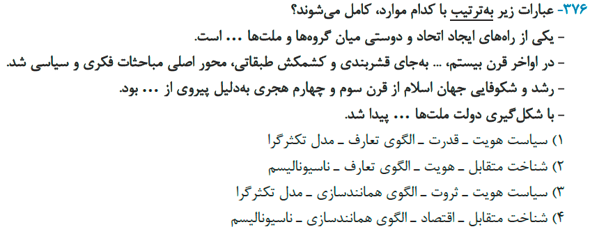 * نکته: در اواخر قرن بیستم هویت به جای قشربندی و کشمکش طبقاتی، محور اصلی مباحثات فکری و سیاسی شد. در دورۀ پسامدرن، هویت از منظر گروههای مختلف اجتماعی و توسط آنها تعریف میشود. یعنی علاوه بر ثروت و قدرت، هویت و دانش نیز کانون نزاع می شوند. در همۀ این عرصه ها سیاست هویت ایجاد می شود.