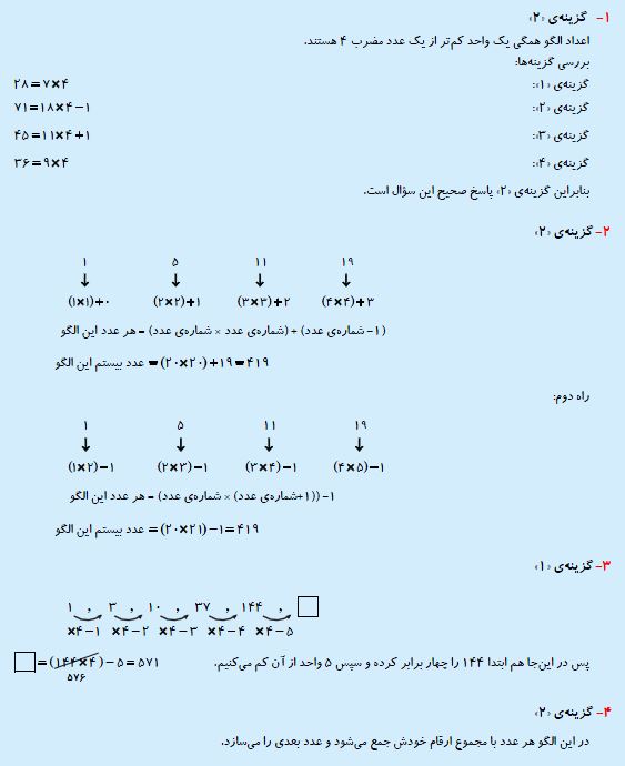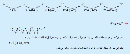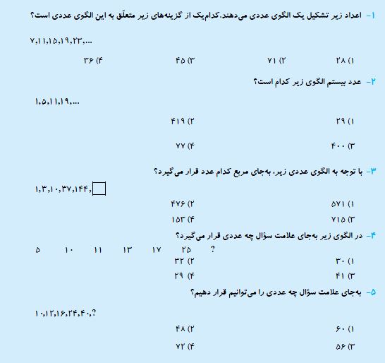 ششمی های عزیز سلامدر ادامه برای شما 5 سوال پیشنهادی ریاضی منطقی از بخش الگوهای عددی برای آمادگی آزمون 17 اردیبهشت به همراه پاسخ تشریحی آورده شده است. موفق باشید.فرزانه خاکپاش - گروه تولید آزمون