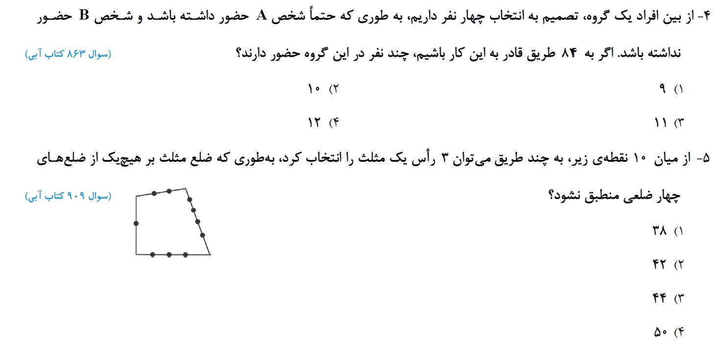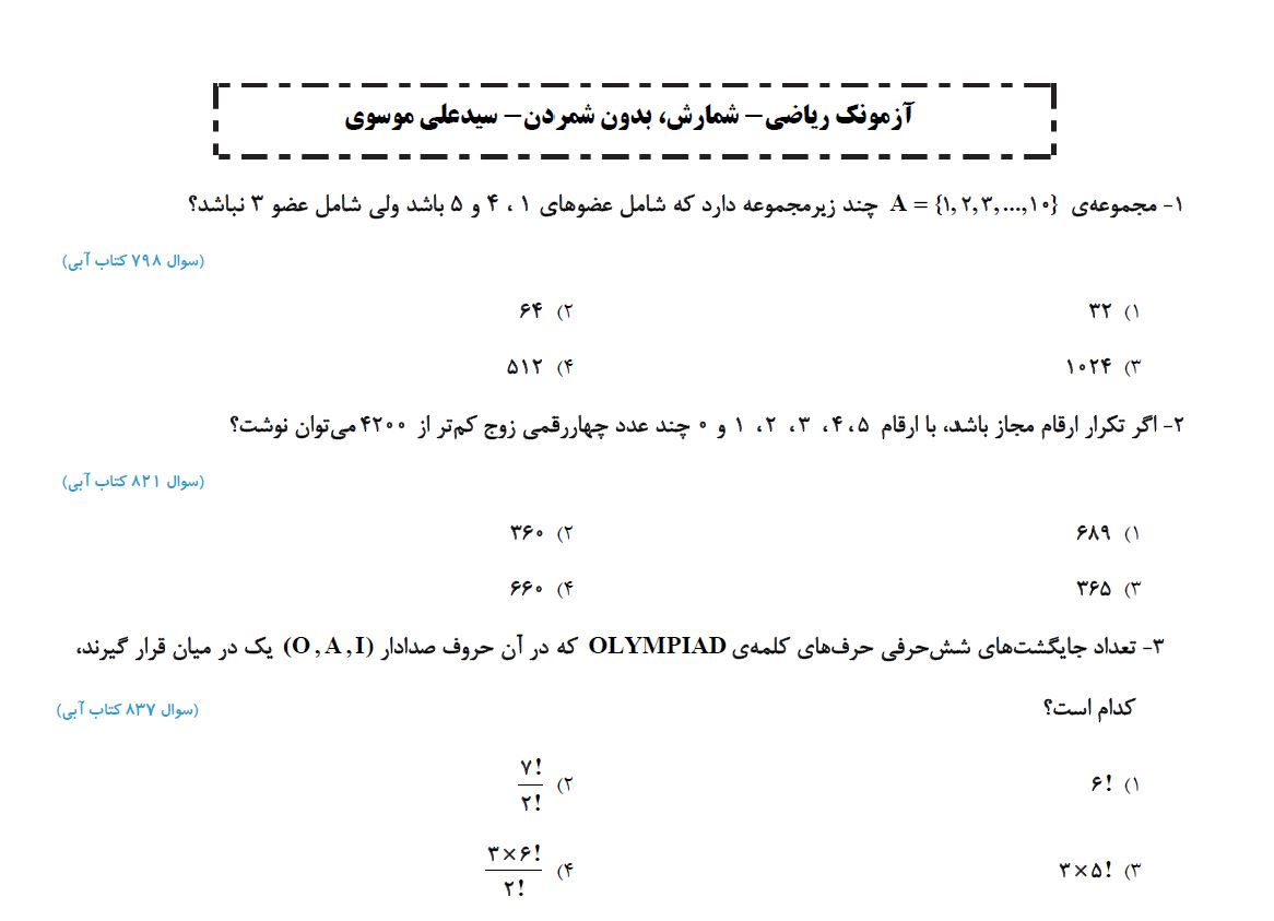 در این آزمونک 5 سوال استاندارد و شناسنامه دار از کتاب آبی از فصل شمارش بدون شمردن آورده شده است تا تسلط خود را افزایش دهید.