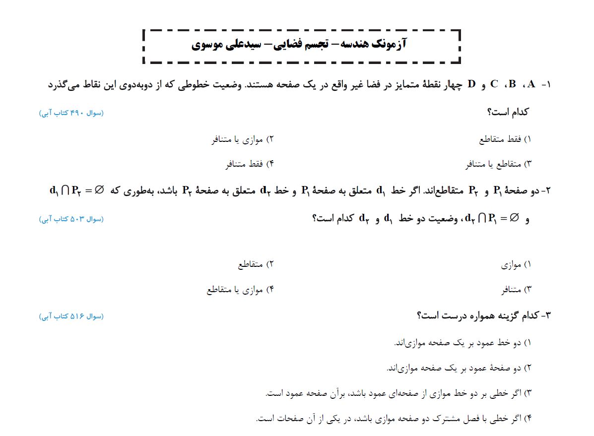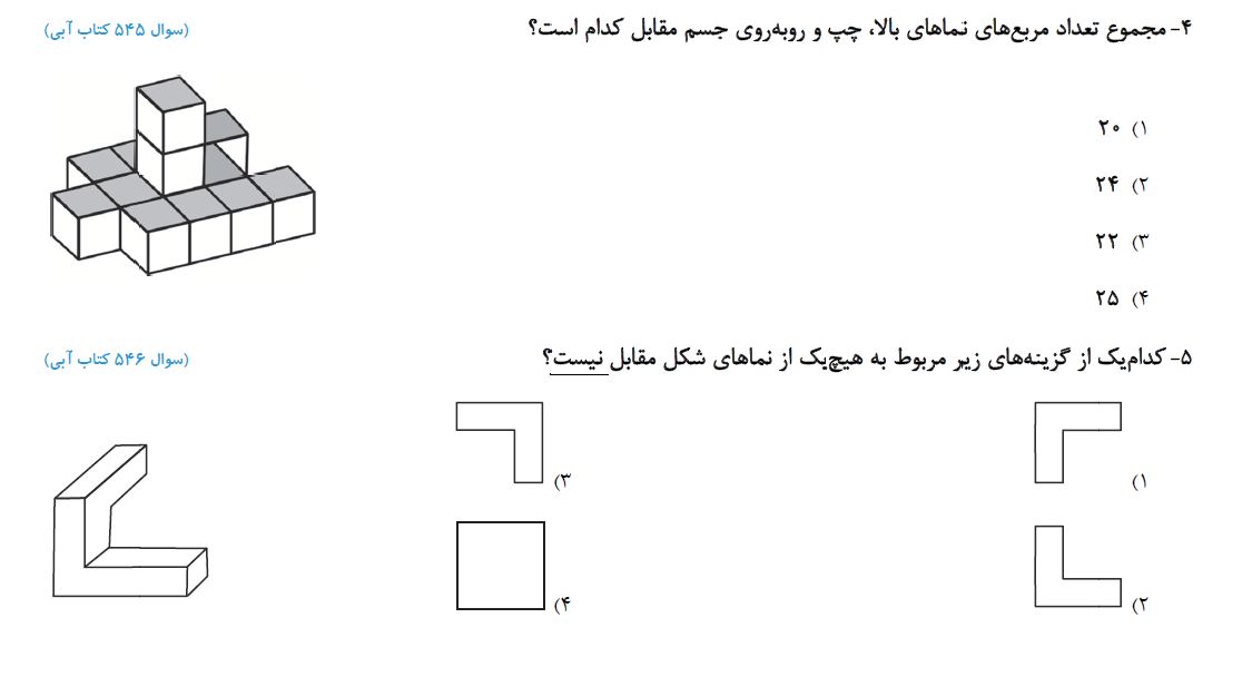 در این آزمونک 5 سوال استاندارد و شناسنامه دار از کتاب آبی از فصل تجسم فضایی آورده شده است تا تسلط خود را افزایش دهید.