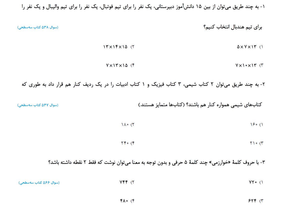 5 سوال کتاب سه سطحی ریاضی دهم( به همراه پاسخ) از فصل شمارش بدون شمردن، متناسب با آزمون 17 اردیبهشت در این مطلب آمدهاست.