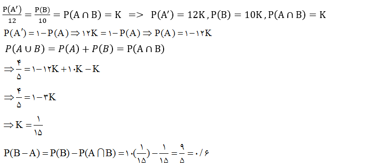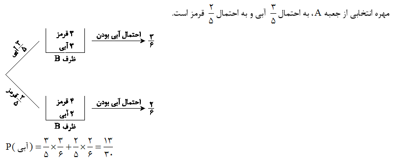 -- از کیسه A که شامل 3 مهره آبی و 2 مهرة قرمز است. یک مهره به تصادف خارج و در کیسه B که شامل 3 مهره قرمز و 2 مهرةه آبی است قرار میدهیم و از کیسه B یک مهره خارج میکنیم. احتمال آن که این مهره آبی باشد، چه قدر است؟