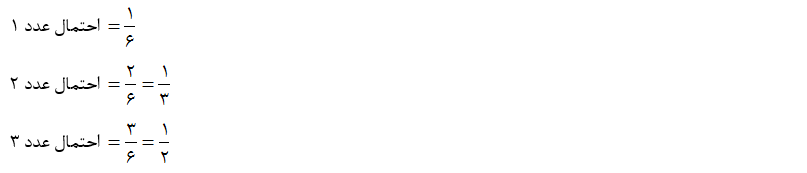 ابتدا احتمال آمدن عدد 1، عدد 2 و عدد 3 را در پرتاب تاس به دست میآوریم: