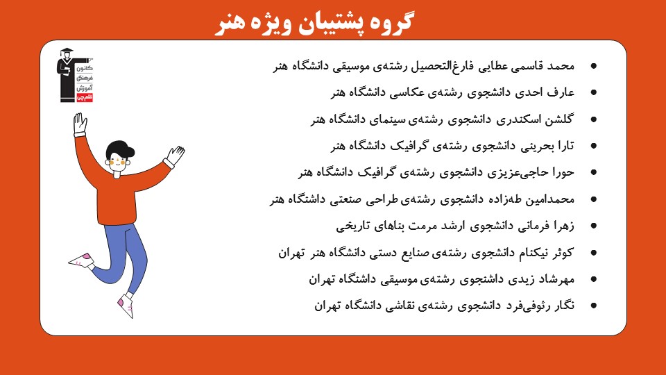 دوستان عزیز کنکوری، اگر تو این مدت باقیمونده نیاز به مشاور دارین تا راهنماییتون کنه و مشکلات و اشکالاتتون رو رفع کنه میتونید از لیست زیر یکی از پشتیبانان هنر رو که خودشون رتبهی برتر کنکور بودن رو انتخاب کنید و به موفقیت نزدیکتر بشید.