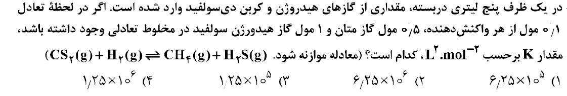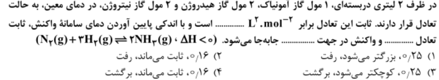 کامنت کاربر مقدار ثابت تعادل واکنش تهیه آمونیاک در سه دمای 25 و 200و 400درجه سلسیوس به صورت زیر است.1 )خیلی زیاد 2)متوسط 3)کم کدوم میشه چنتا کتاب جوابای گوناگون دادن به نظرم سرعت واکنش رو با ثابت تعادل اشتباه گرفته بودند . چند میشه دوستان ؟_ثبت شده در صفحه دوازدهم تجربی در تاریخ 14000129
