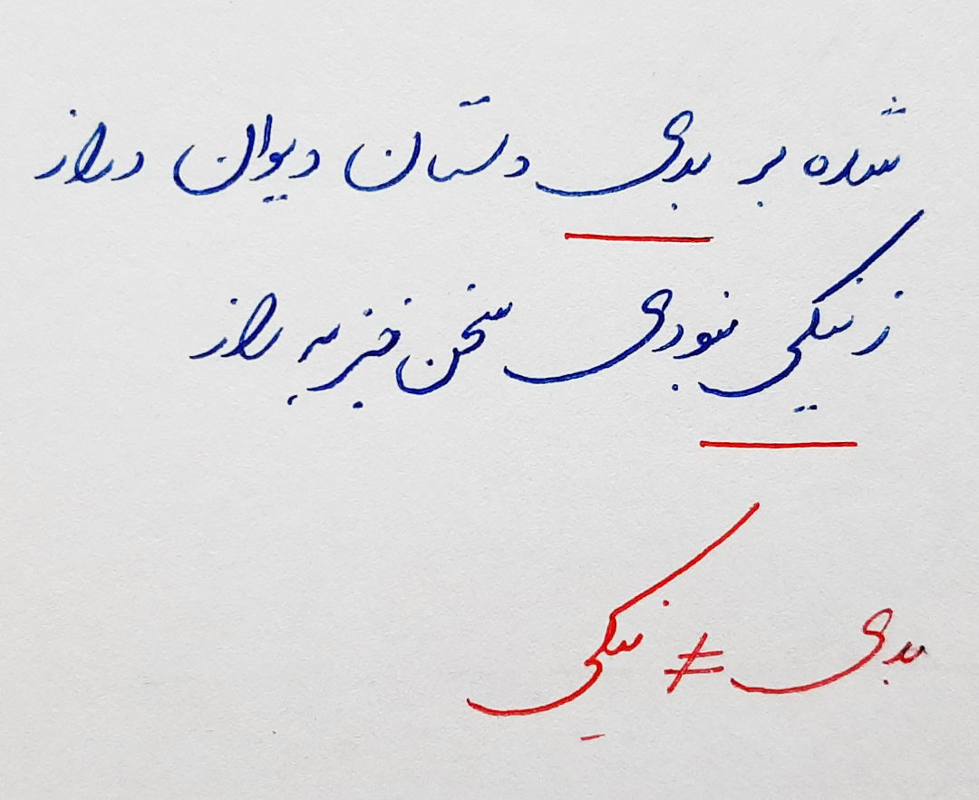کامنت کاربر: آیا این بیت تضاد دارد؟ گرمی مهر به ویرانه و آباد یکی است/ حسن اگر تیغ کشد بنده و آزاد یکی است _ تاریخ ثبت: 13991205 ثبت شده در صفحه مقطع: دهم