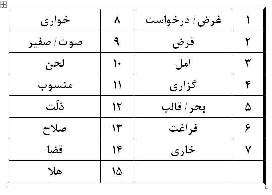 14) بـا قـضـا پـنـجه مـزن ای تـنـد و تیز / تـا نـگـیـرد هــم ... بـا تـو سـتـیـز (غذا، غزا، قضا)