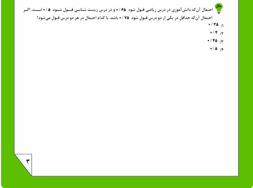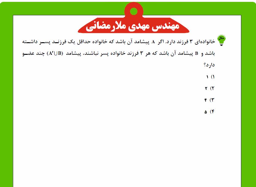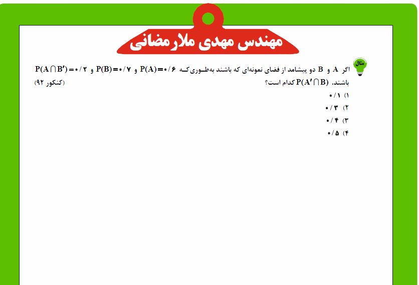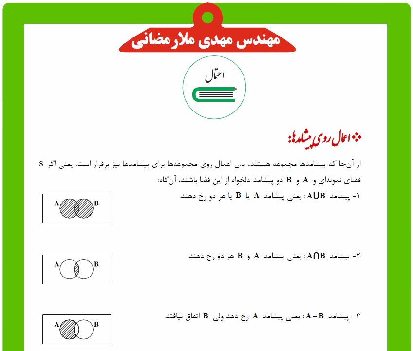 دوستان خوب دهمی سلامدر این مطلب، خلاصه نکات فصل «آمار و احتمال»، مبحث احتمال متناسب با آزمون 31 اردیبهشت، آورده شده است .نویسنده: مهدی ملارمضانی - کارشناس ارشد عمران دانشگاه تهران - دبیر ریاضی
