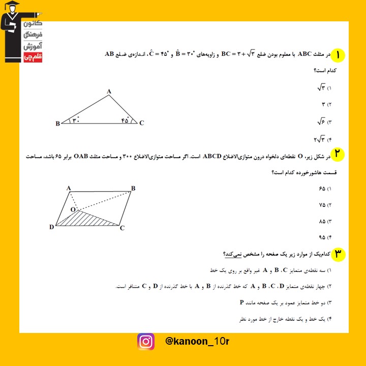 نمونه سوال تستی هندسه آمادگی آزمون 31 اردیبهشت دهم +پاسخدر این فایل 10 سوال تستی هندسه دهم( به همراه پاسخ) متناسب با آزمون 31 اردیبهشت آمدهاستبرای مشاهده ی کامل سوالات و پاسخ آن ها، به فایل پیوست مراجعه کنید.