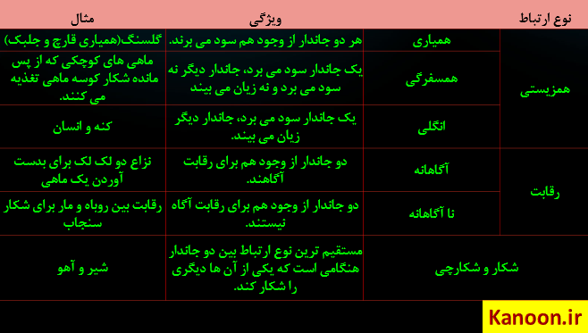 در انتها به جدولی از روابط بین جانداران در یک بوم سازگان اشاره کردیم.