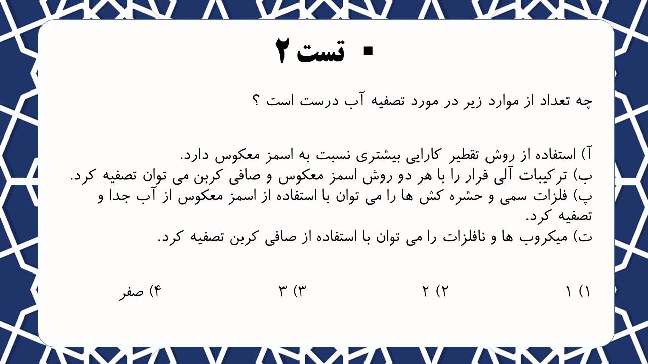فایل پی دی اف زیر شامل نمونه سؤالات به همرhه پاسخ تشریحی کامل از مباحث اسمز و تصفیه آب شیمی آزمون 31 اردیبهشت ماه است.
