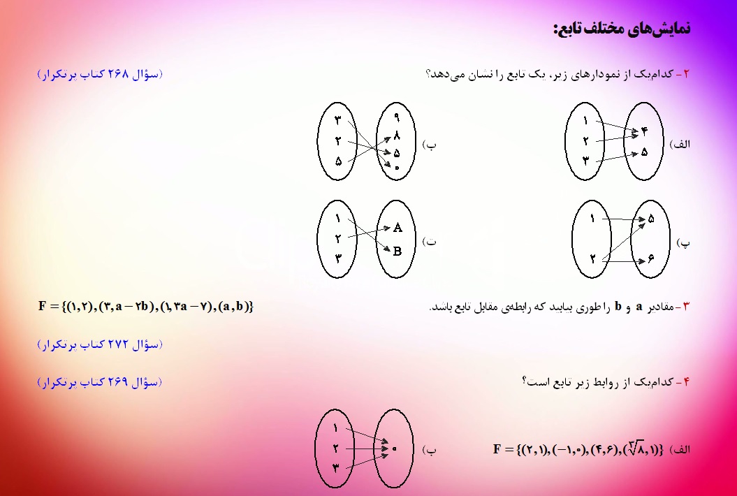 سلام به دانشآموزان عزیز بعد از مطالعه درسنامه مربوط به مفهوم تابع، نمونه سؤالات زیر را حل کرده و برای داشتن پاسخ تشریحی آنها فایل PDF را دانلود کنید.