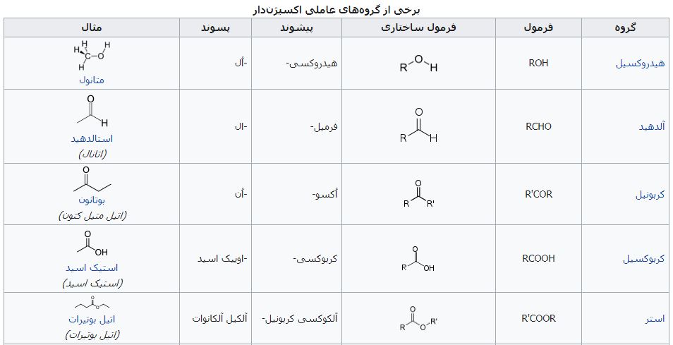 مهمترین ترکیبات آلی حاوی اکسیژن عبارتاند از: (در این ترکیبات "R" یک گروه آلی است): الکلها (R-OH)، اترها (ROR)، کتون (R-CO-R)، آلدهیدها (R-CO-H)، کربوکسیلیک اسیدها (R-COOH)، استرها (R-COO-R)، انیدرید اسیدها (R-CO-O-CO-R)، و آمیدها (R-CO-NR۲).[۷۱] بسیاری از حلالهای مهم آلی که حاوی اکسیژن هستند عبارتاند از: استون، متانول، اتانول، ایزوپروپانول، فوران، تتراهیدروفوران، دیاتیل اتر، دیوکسان، اتیل استات، دیمتیل فرمآمید، دیمتیل سولفوکسید و استیک اسید.