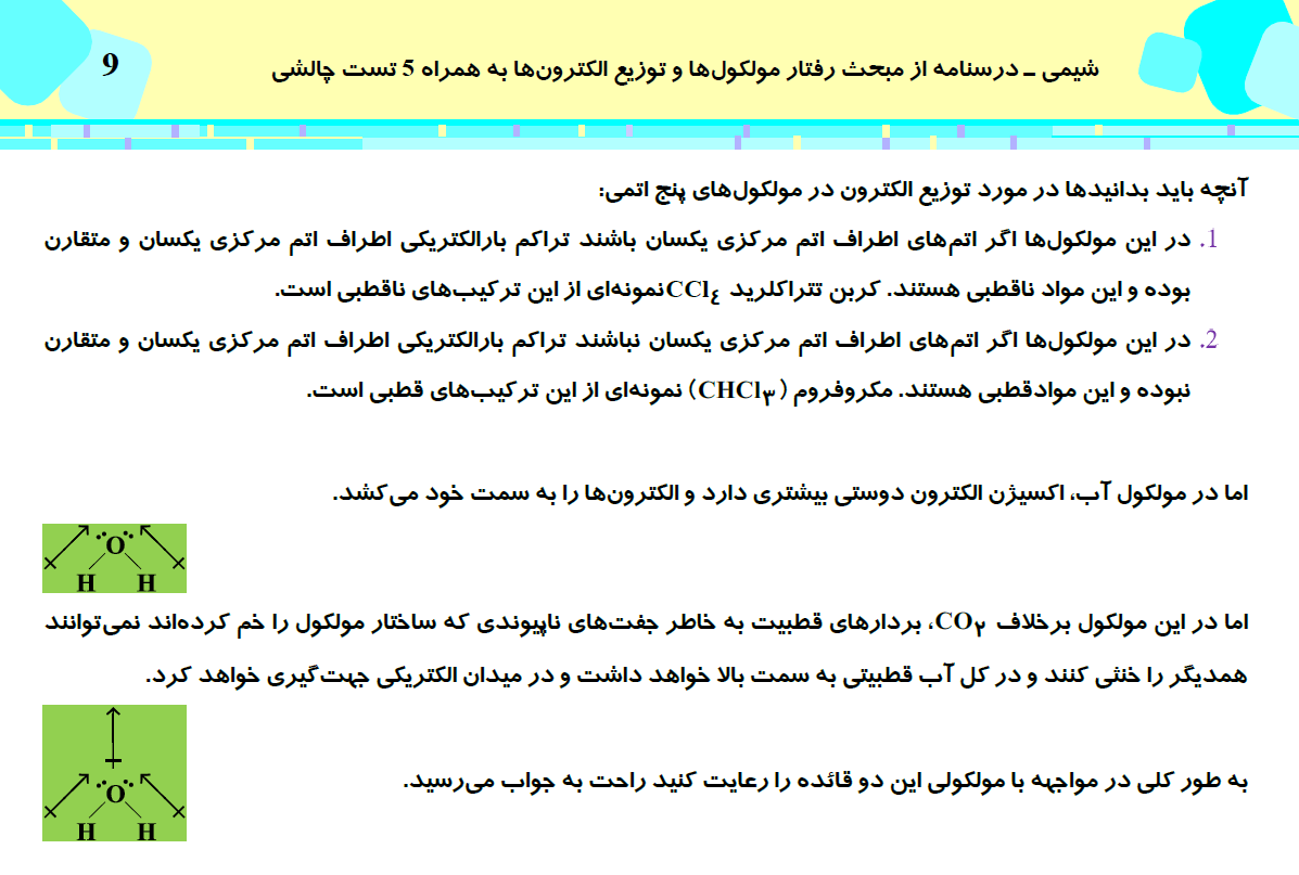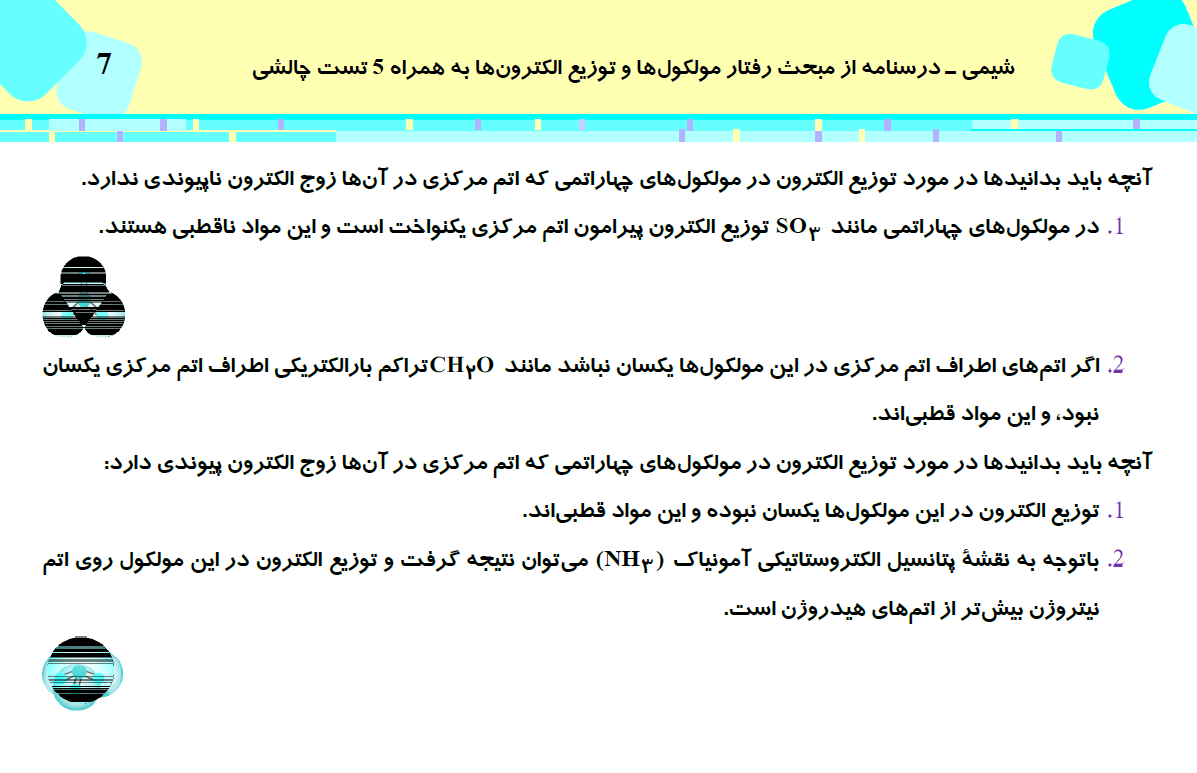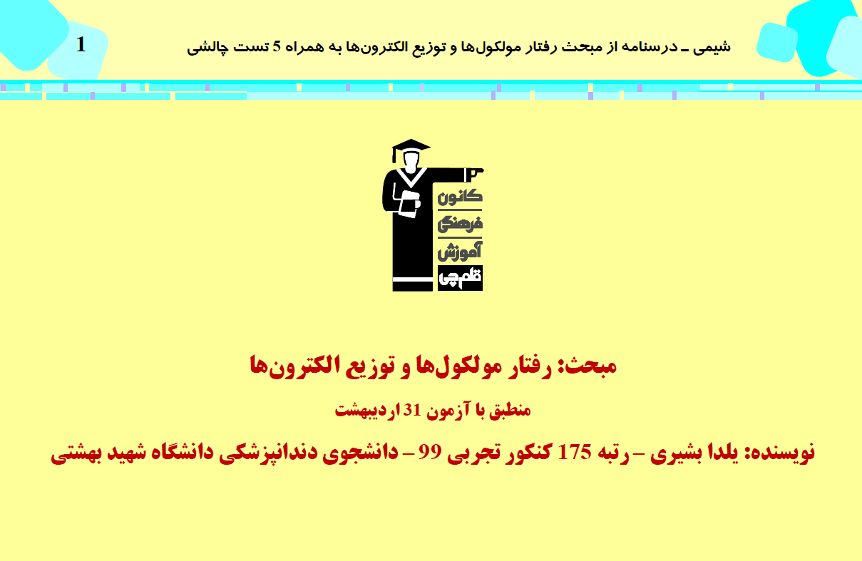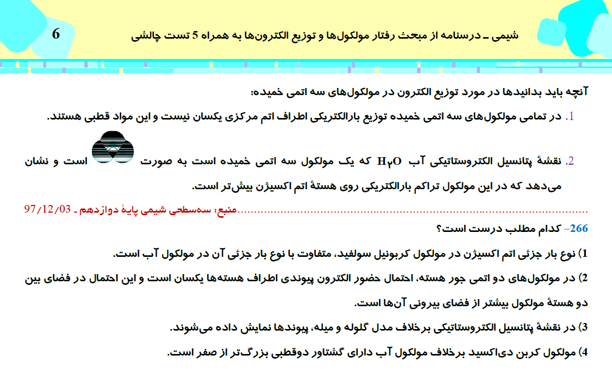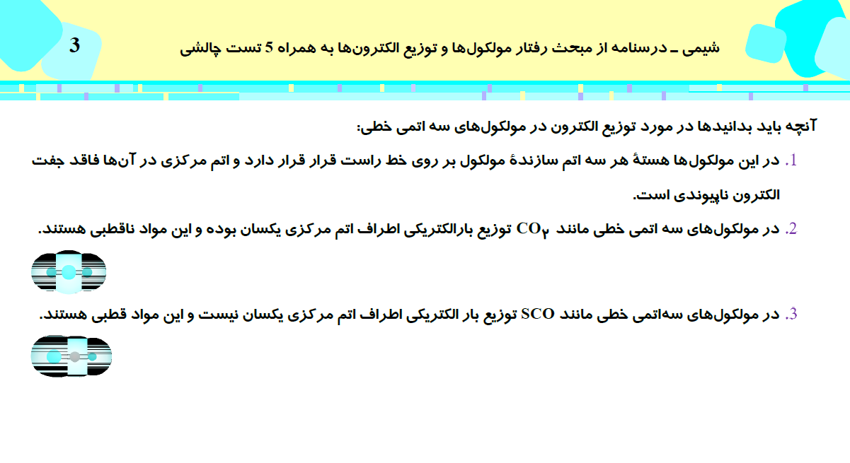 این مطلب شامل درسنامه با 5 تست چالشی از کتاب سه سطحی شیمی (3)، مبحث رفتار مولکولها و توزیع الکترونها، مطابق با برنامه راهبردی آزمون 31 اردیبهشت می باشد.