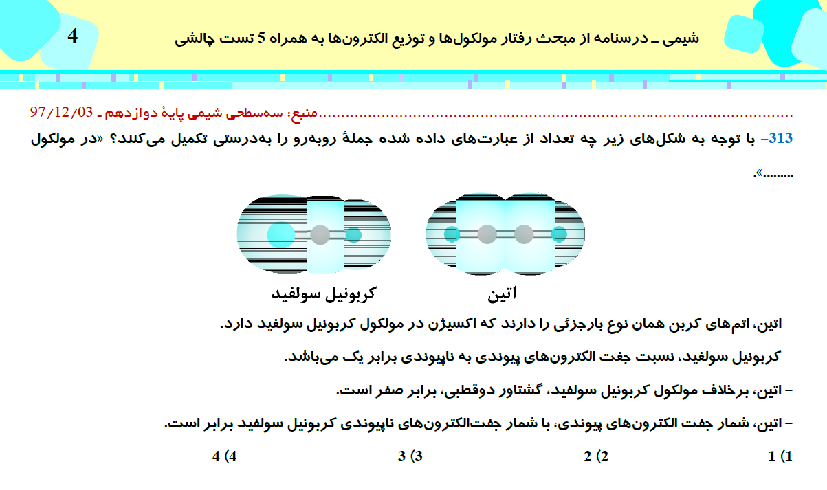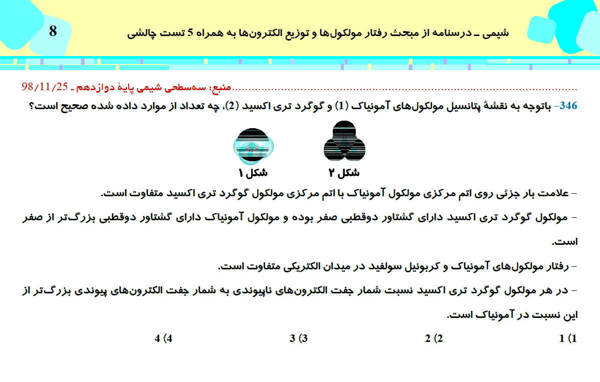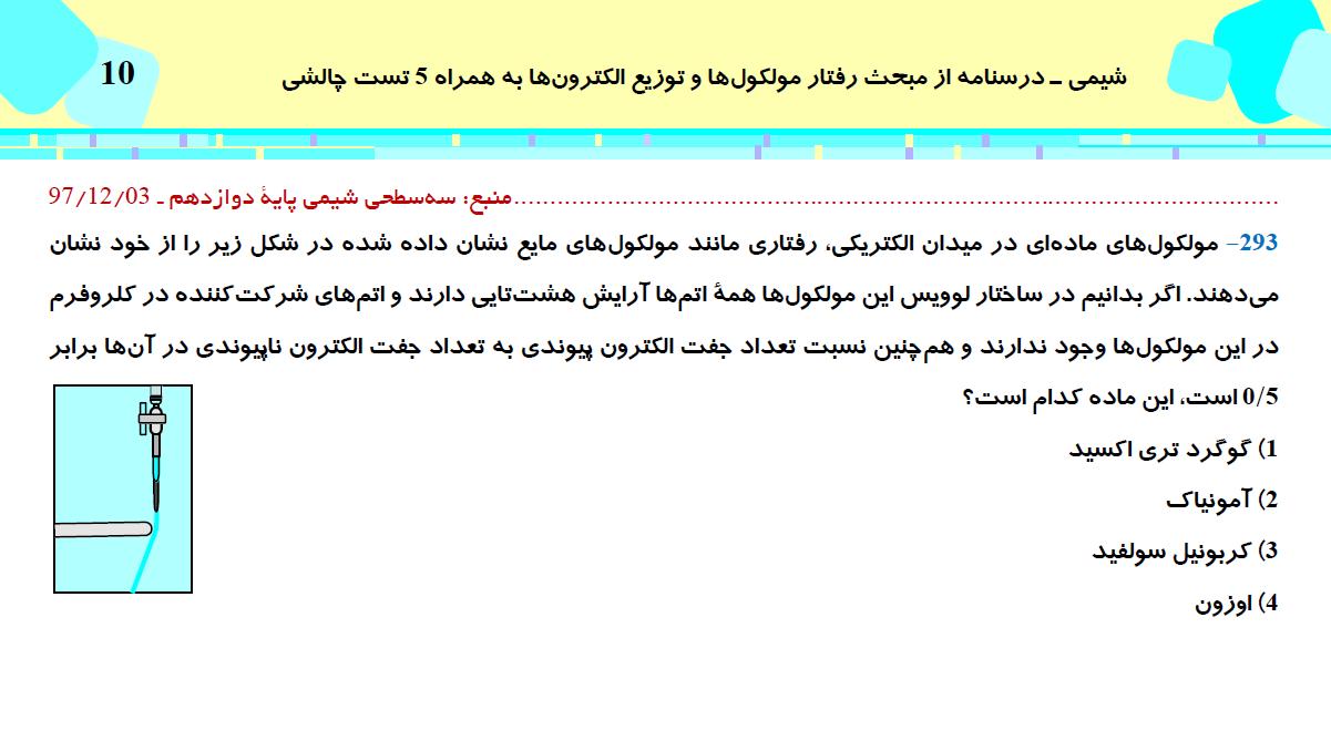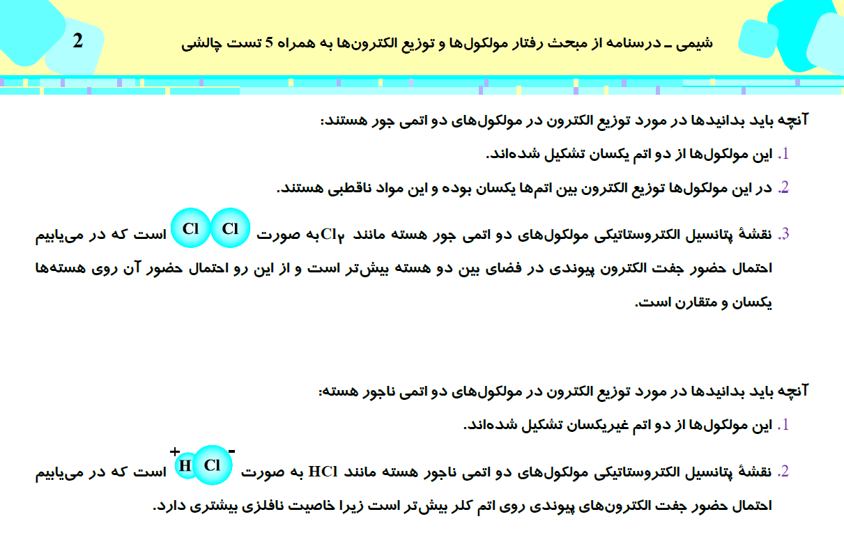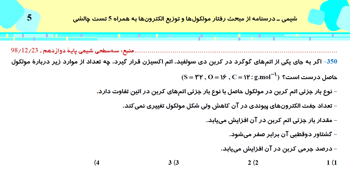 این مطلب شامل درسنامه با 5 تست چالشی از کتاب سه سطحی شیمی (3)، مبحث رفتار مولکولها و توزیع الکترونها، مطابق با برنامه راهبردی آزمون 31 اردیبهشت می باشد.