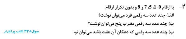 در این مطلب 3 سوال کتاب پرتکرار ریاضی دهم (به همراه پاسخ) از فصل شمارش،بدون شمردن مبحث اصل ضرب و تعمیم آن و جایگشت ، متناسب با آزمون 31 اردیبهشت آمدهاست،حل این سوالات به شما در آمادگی آزمون 31 اردیبهشت و امتحانات نیمسال دوم کمک خواهدکرد.