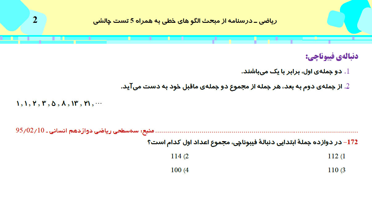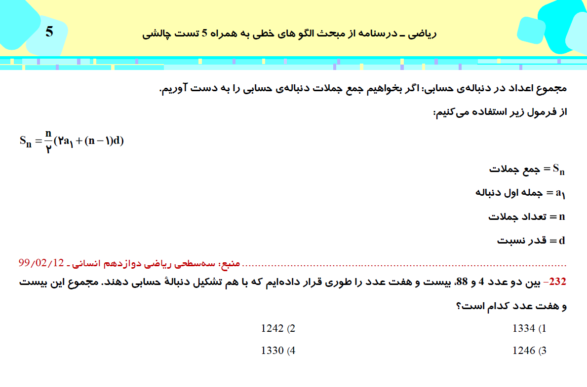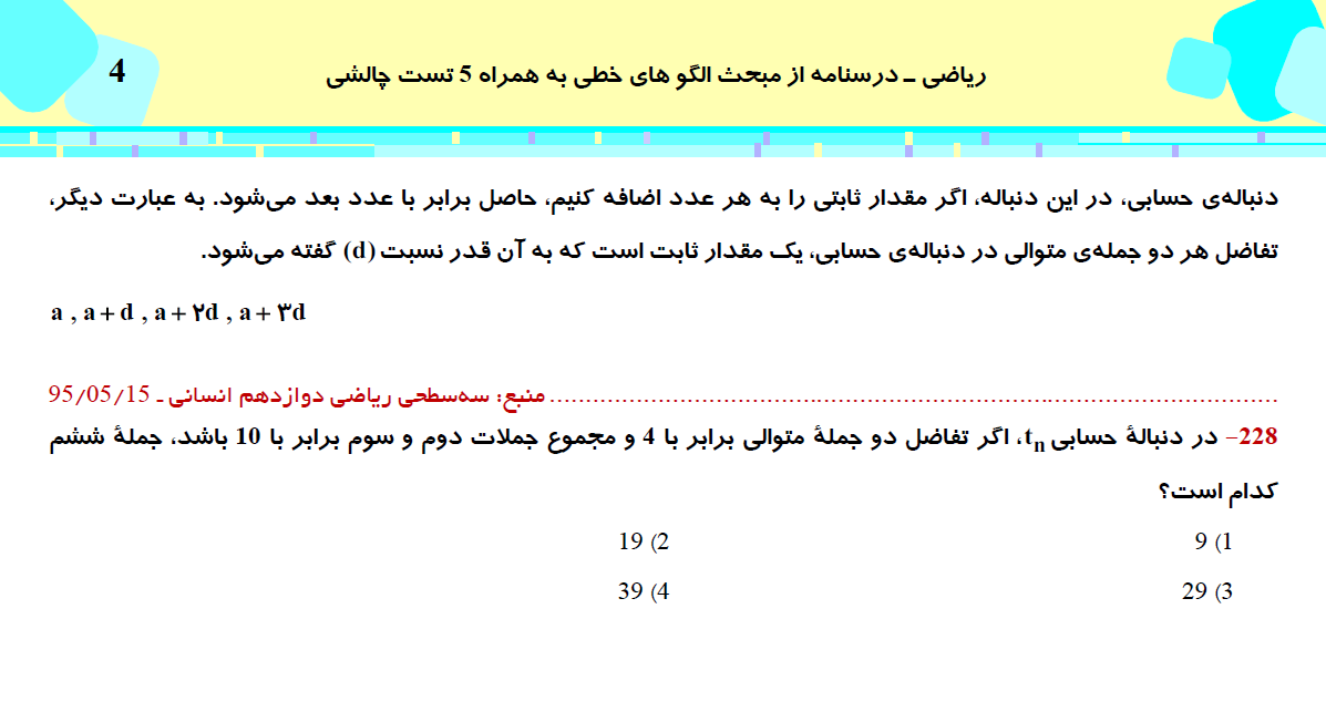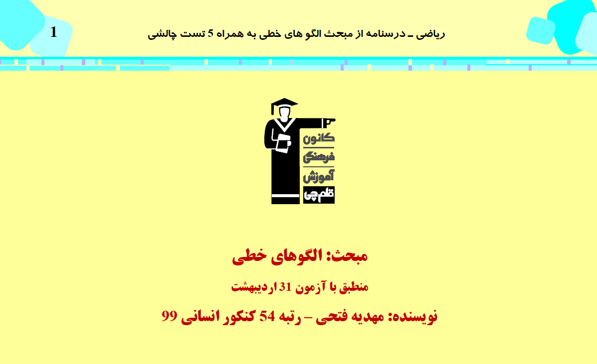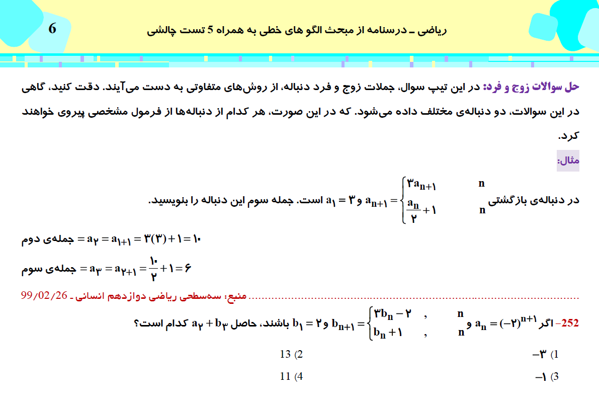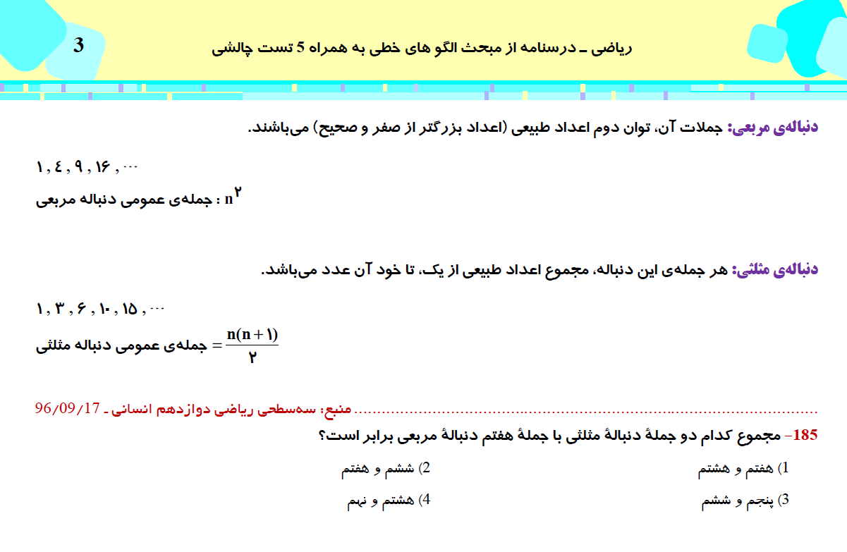 این مطلب شامل درسنامه با 5 تست چالشی از کتاب سه سطحی ریاضی و آمار (3)، مبحث الگو های خطی، مطابق با برنامه راهبردی آزمون 31 اردیبهشت می باشد.