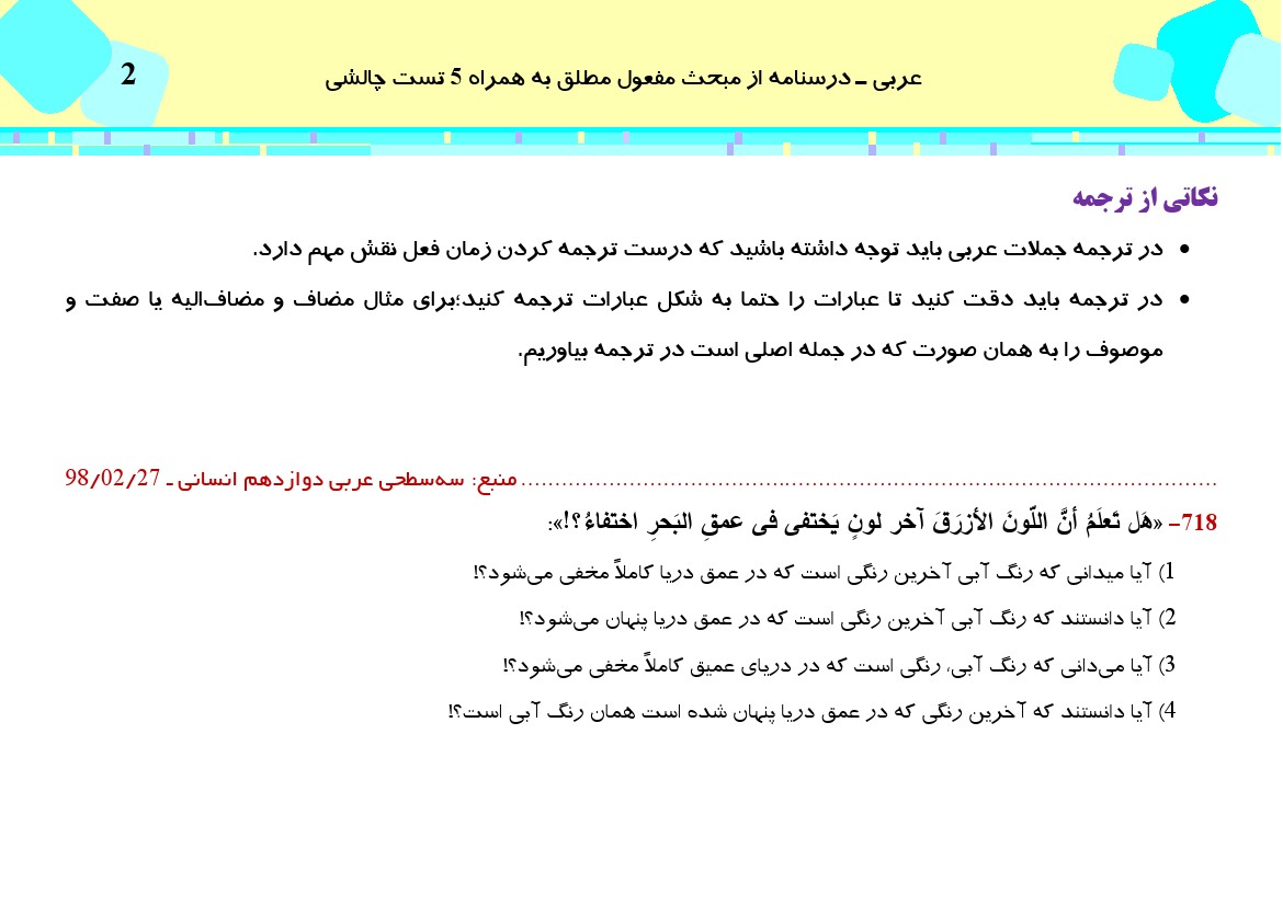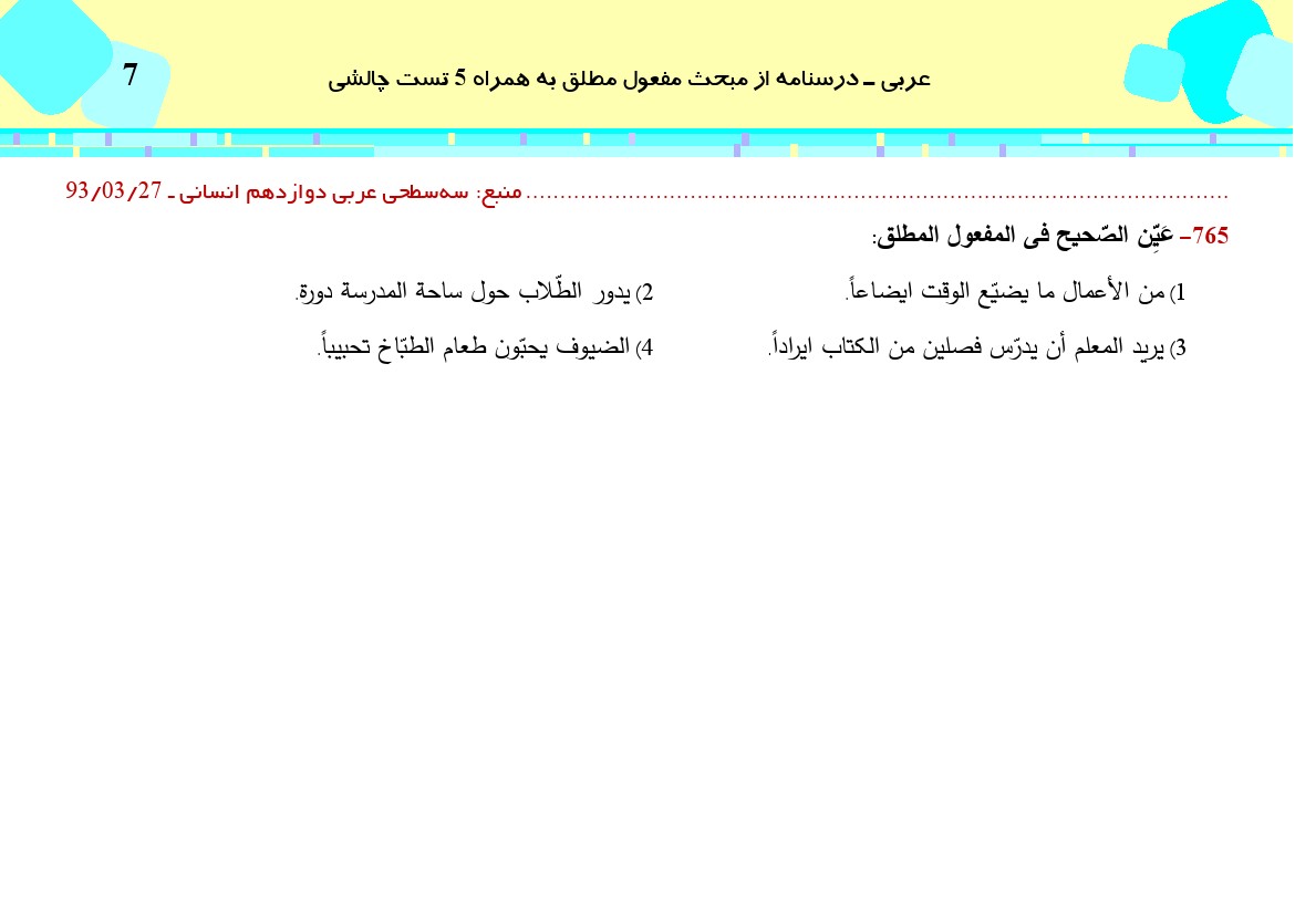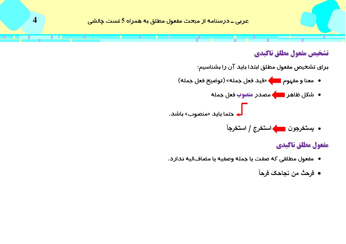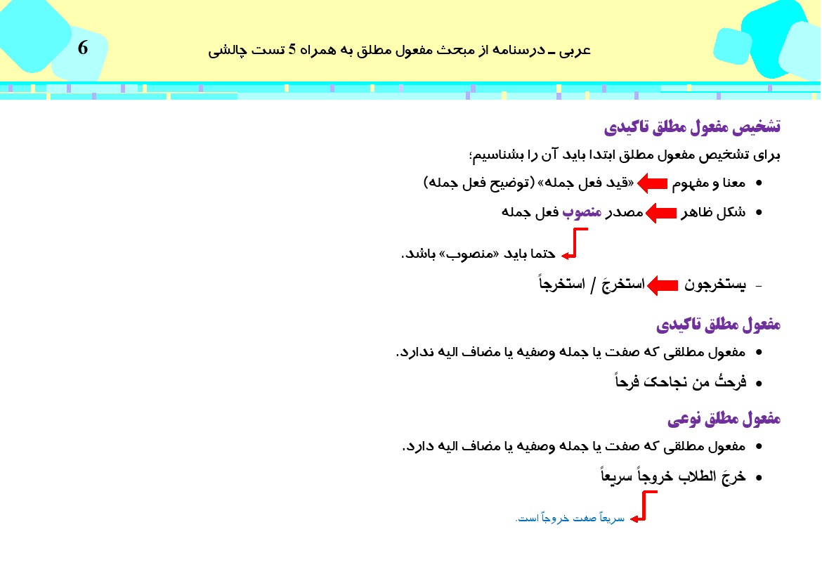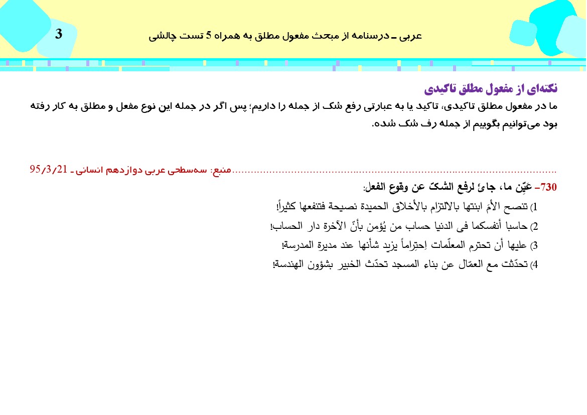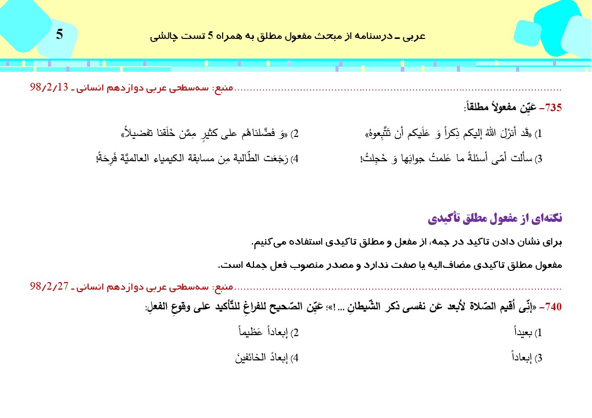 این مطلب شامل درسنامه عربی اختصاصی انسانی دوازدهم با 5 تست چالشی از کتاب سه سطحی عربی (3)، مبحث مفعول مطلق، مطابق با برنامه راهبردی آزمون 31 اردیبهشت می باشد.