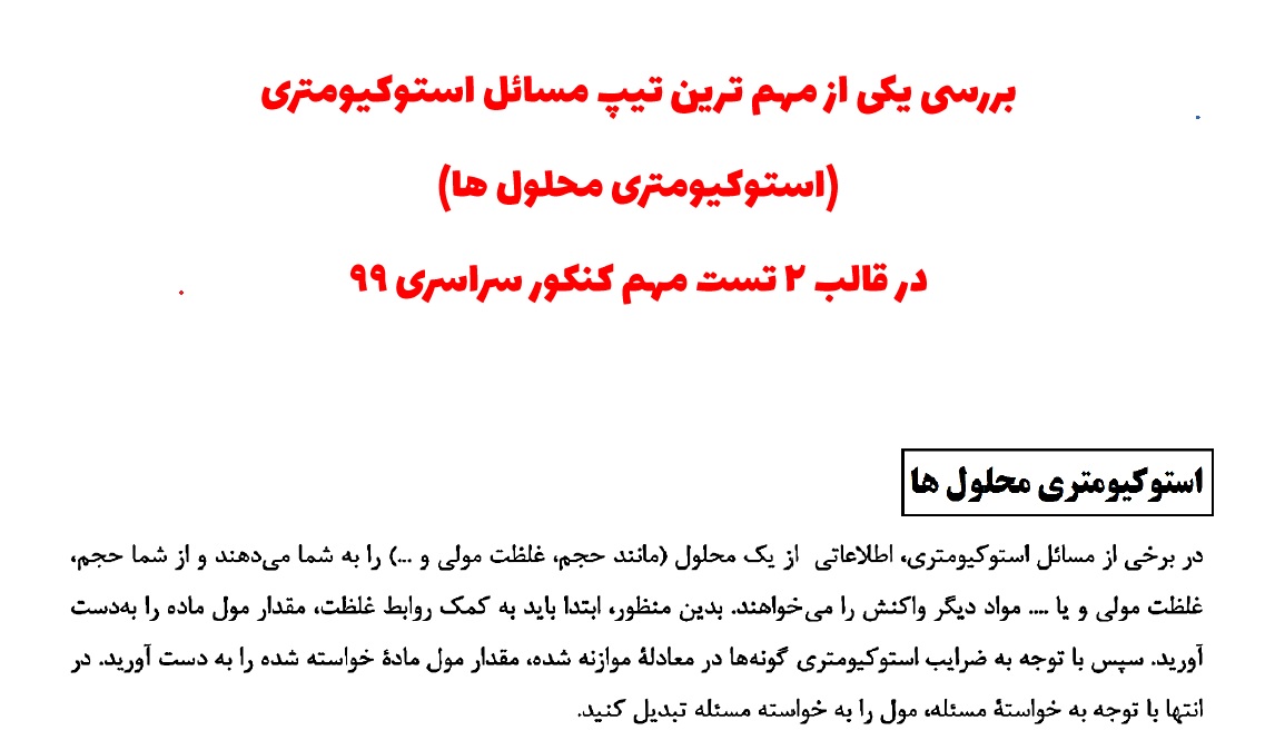 برای خواندن ادامه مطلب زیر (یکی از پرکاربردترین مسائل استوکیومتری محلولها)، فایل pdf زیر را دانلود کنید.