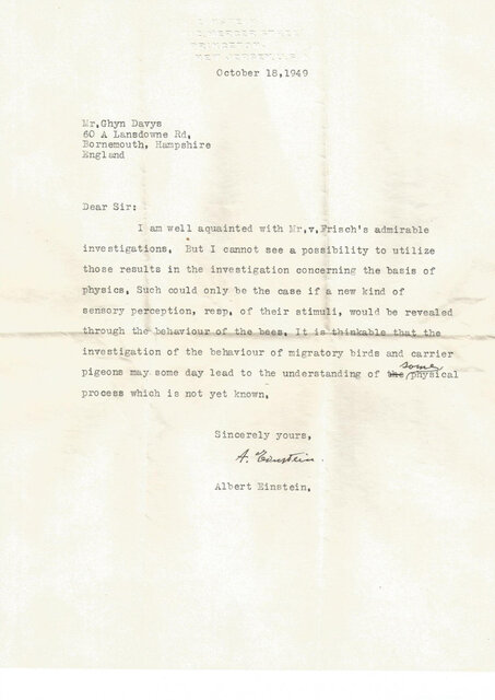 در این نامه که متعلق به سال 1949 است، در مورد احساسات زنبورها و پرندگان بحث شده و اشاره به "فرآیند جسمی و فیزیکی که هنوز شناخته شده نیست" دارد.