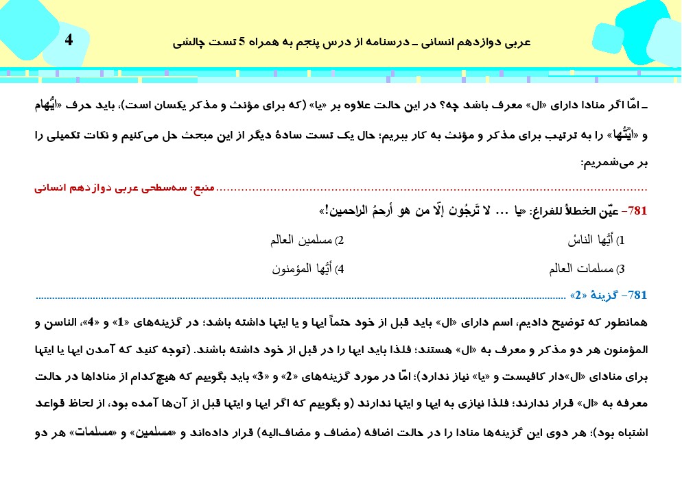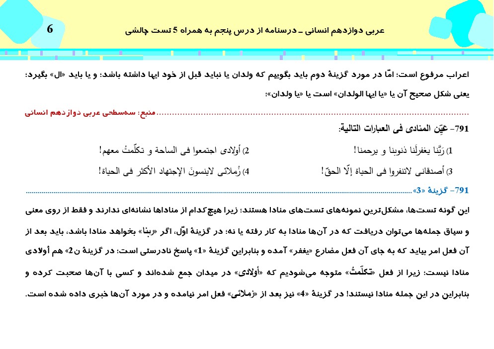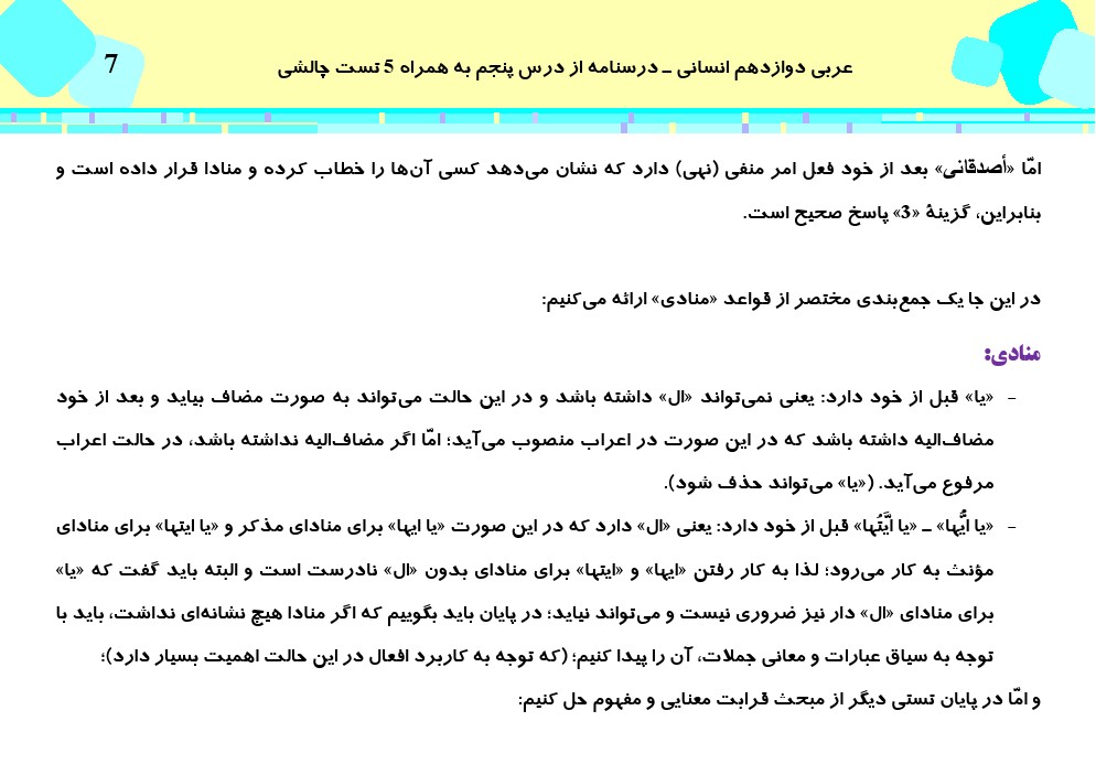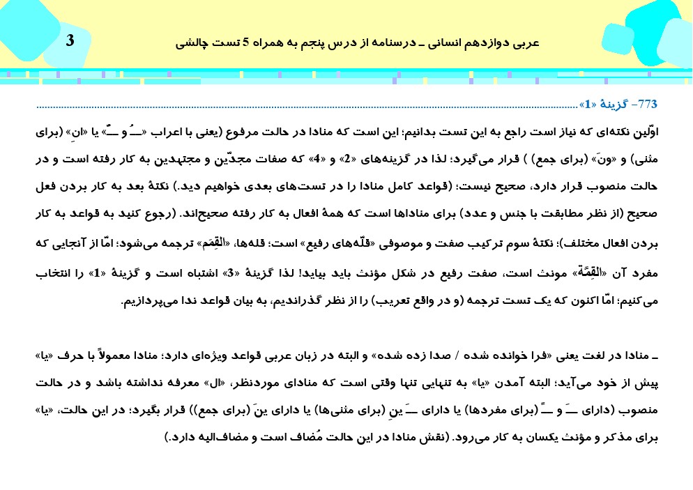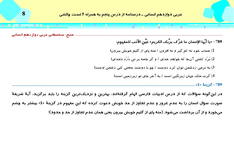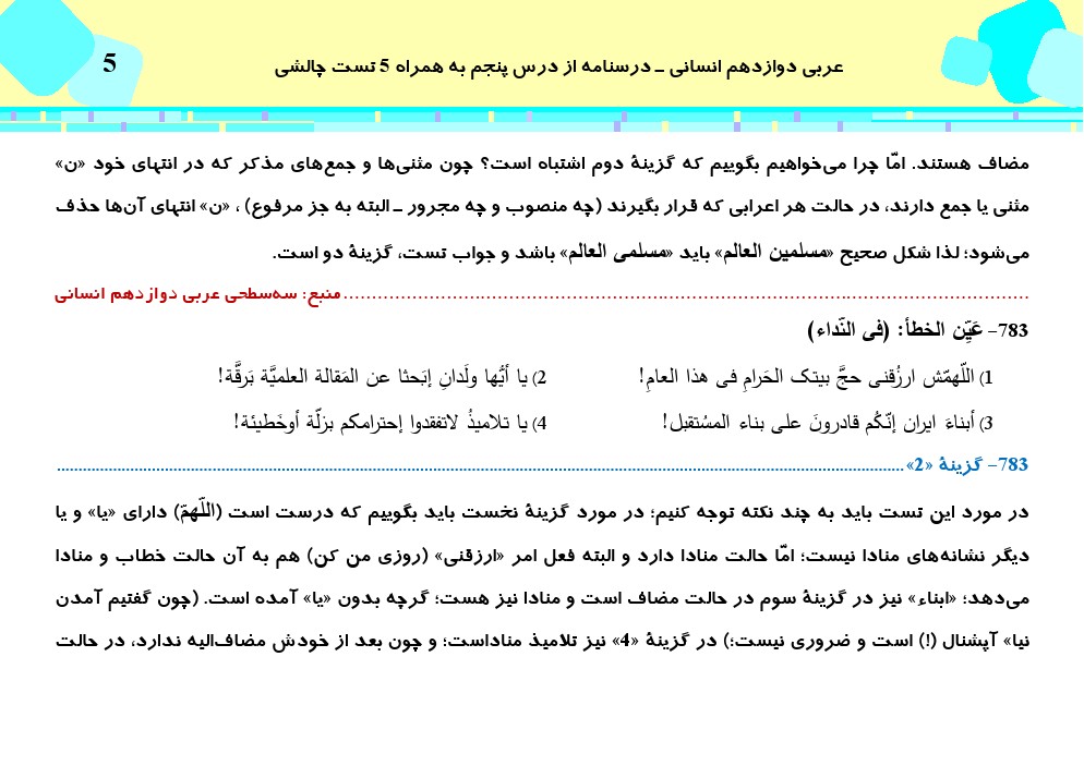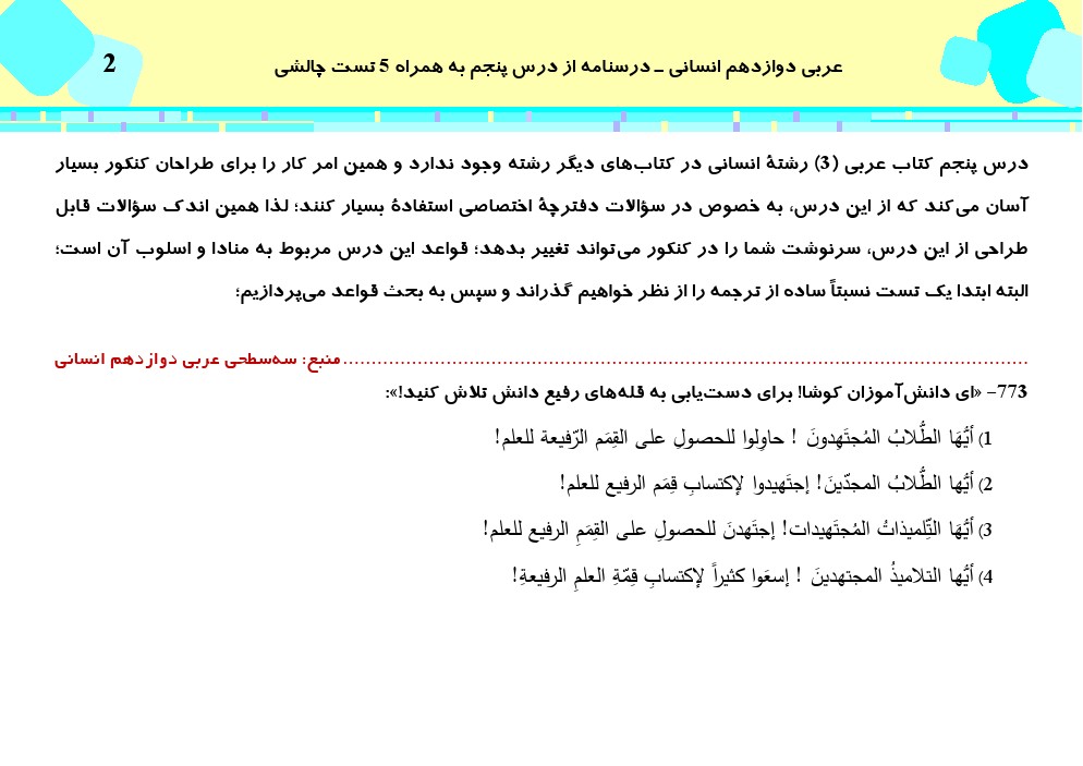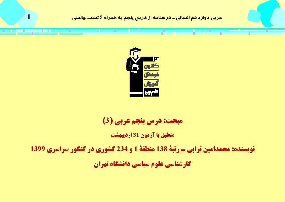 این مطلب شامل درسنامه با 5 تست چالشی از کتاب سه سطحی عربی انسانی (3)، مبحث درس پنجم، مطابق با برنامه راهبردی آزمون 31 اردیبهشت میباشد.
