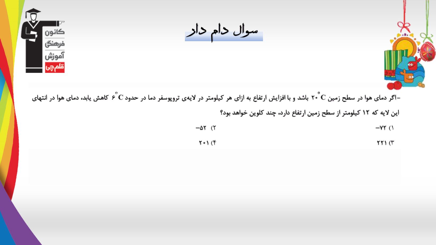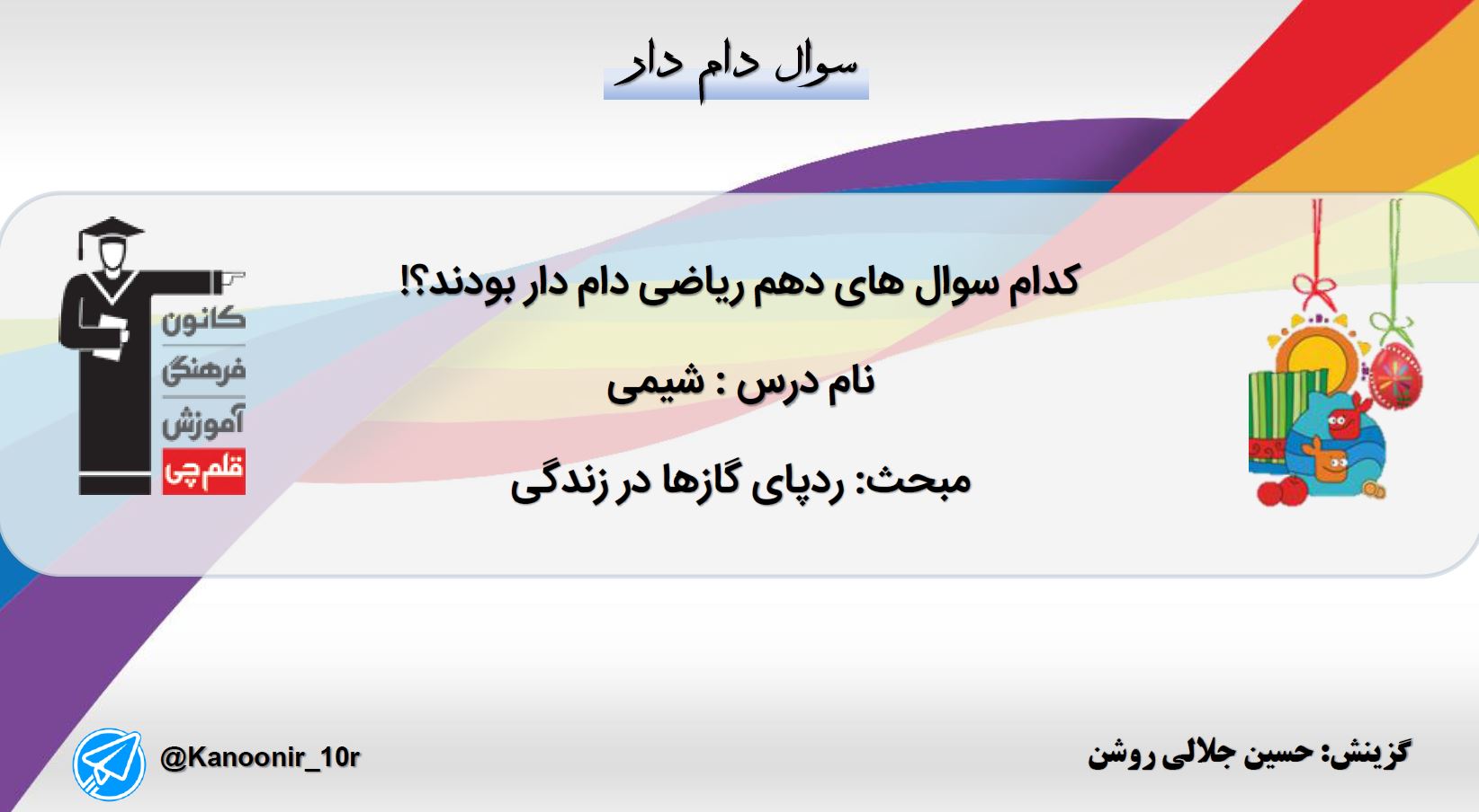 دوستان خوب دهمی سلامدر این مطلب 8 سوال کتاب دام دار شیمی دهم (به همراه پاسخ) از فصل ردپای گازها در زندگی، متناسب با آزمون 19 اسفند آمدهاست.برای مشاهده ی تمام سوالات و پاسخ ها،فایل پی دی اف ضمیمه شده را دانلود کنید.
