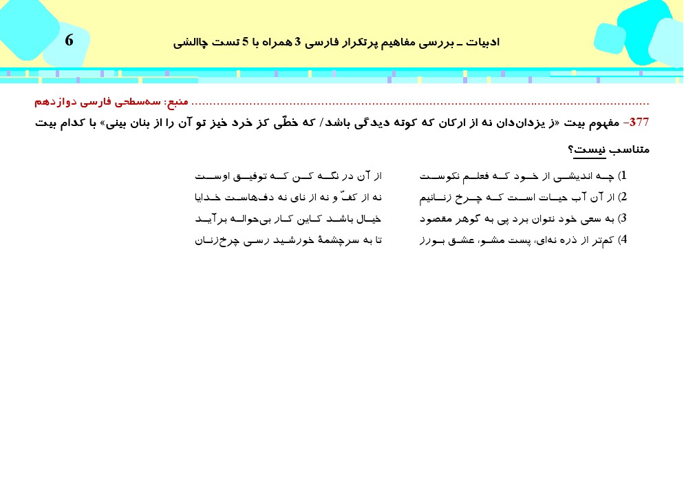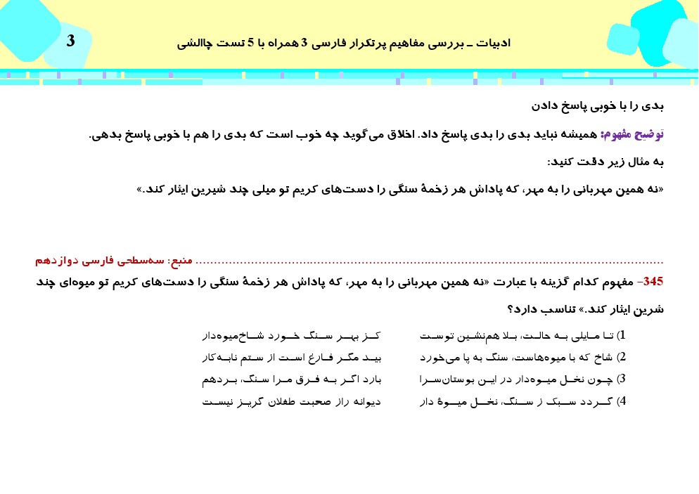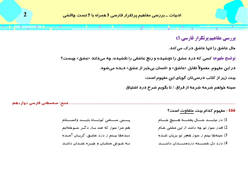 این مطلب شامل درسنامه با 5 تست چالشی از کتاب سه سطحی فارسی (3)، بررسی مفاهیم پرتکرار فارسی 3، مطابق با برنامه راهبردی آزمون 31 اردیبهشت میباشد.
