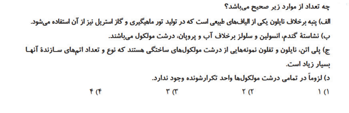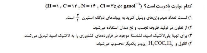 کامنت کاربر جرم یک نمونه از پلیمر به کار رفته در ظروف یکبار مصرف 6/24 کیلو گرم است. در ساختار این پلیمر چند پیوند دوگانه میتواند وجود داشته باشد؟ (120 اِن آ یا 180 اِن آ) اِن آ عدد اووگادرو هستش._ثبت شده در صفحه دوازدهم تجربی در تاریخ 14000214