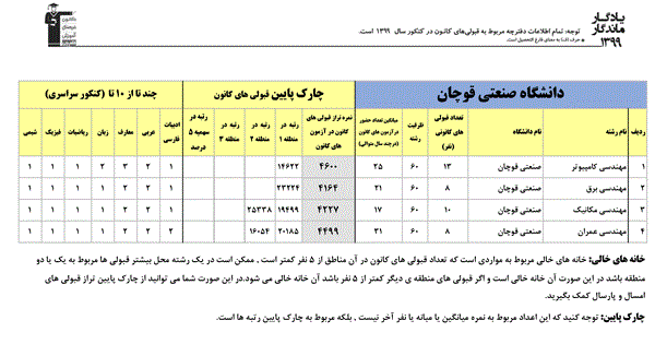 یادگار ماندگار : قبولی های کانونی دانشگاه صنعتی قوچان در همه رشته ها در سال 99 را در ادامه مشاهده کنید.فایل با کیفیت قبولی های سال 99 را در قسمت فایل های ضمیمه دانلود کنید.