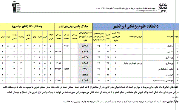 یادگار ماندگار : قبولی های کانونی دانشگاه علوم پزشکي ايرانشهر و دانشگاه ولايت ايرانشهر در همه رشته ها در سال 99 را در ادامه مشاهده کنید.فایل با کیفیت قبولی های سال 99 را در قسمت فایل های ضمیمه دانلود کنید.