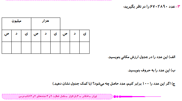 * برای نوشتن یک عدد از حروف به رقم بهتر است از جدول ارزش مکانی استفاده کنیم و در هر طبقه هر مرتبهای که رقمی خوانده نمیشود به جایش صفر قرار دهیم.