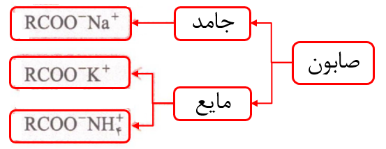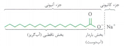 شکل زیر ساختار نوعی صابون جامد رانشان می دهد. همان طور که می بینید صابون دارای یک جز کاتیونی (سدیم) و یک جز آنیونی است.
