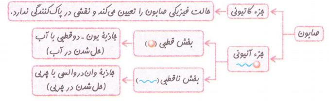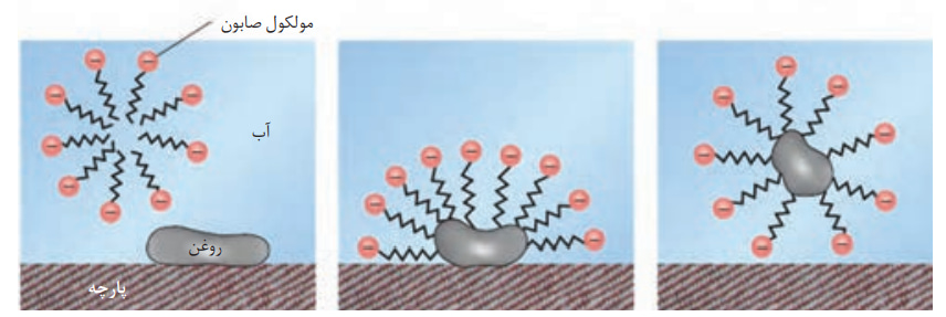 این مشاهده نشان میدهد که بین بخش ناقطبی صابون و مولکول های ناقطبی روغن، نیروی جاذبه واندروالسی برقرار می شود؛ به همین دلیل مولکول های صابون در سرتاسر روغن مایع پخش می شوند. خلاصه این که صابون ماده ای است که هم در چربی ها و هم در آب حل می شود. حالا به راحتی میشه فهمید که صابون چه جوری چربی ها را پاک می کند. چربی ها ناقطبی هستند؛ به همین دلیل آب به تنهایی نمی تواند چربی ها را پاک کند. وقتی صابون وارد آب می شود، کاتیون و آنیون آن از هم جدا می شوند.