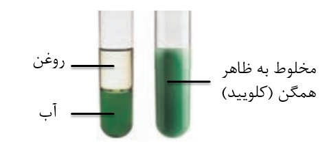 اگر مقداری صابون به مخلوط آب و روغن ضافه کنیم و آن را به هم بزنیم، یک مخلوط پایدار ایجاد می شود که به ظاهر همگن است اما در واقع این مخلوط، ناهمگن بوده و کلوئید است.