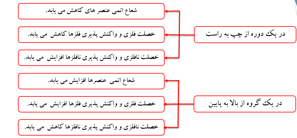 نکته: خصلت فلزی در یک دوره از چپ به راست، کاهش و خصلت نافلزی در یک دوره از چپ به راست، افزایش می یابد.