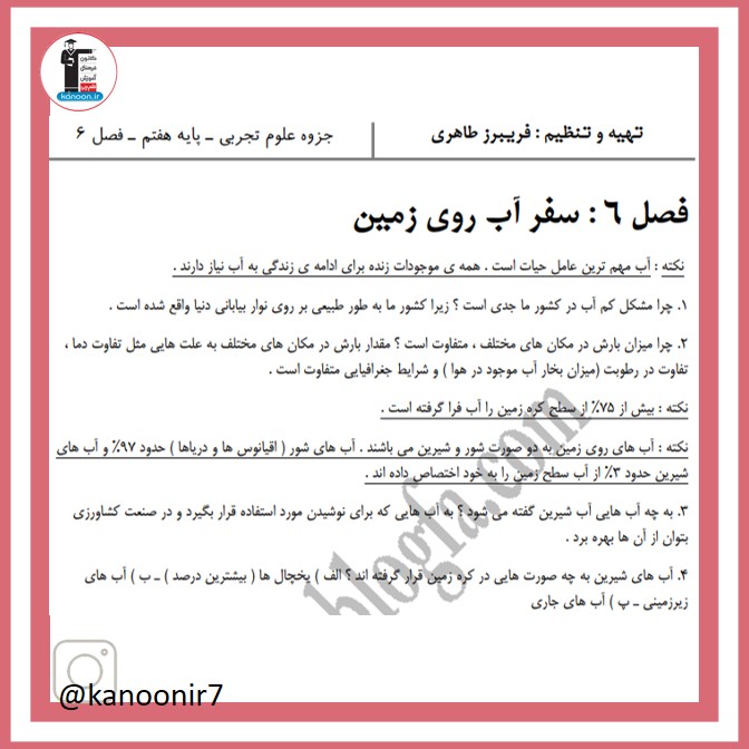 دانش آموزان عزیز سلامامیدواریم مثل همیشه حالتان خوب باشد و هر روز بیشتر از دیروز تلاش کرده و به موفقیت نزدیکتر شوید.در ادامه صفحات درسنامه های فصل ششم علوم هفتم را برایتان گذاشته ایم.در اینستاگرام نیز با ما همراه باشید.