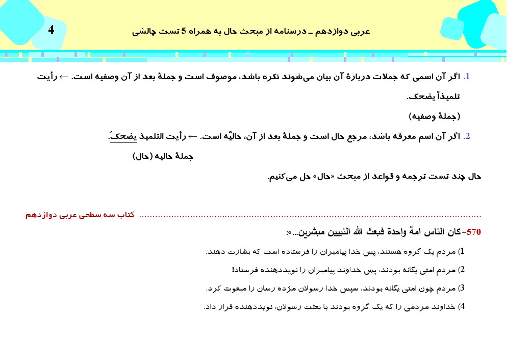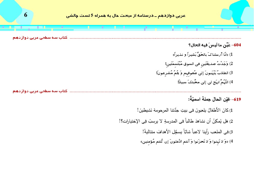 این مطلب شامل درسنامه با 5 تست چالشی از کتاب سه سطحی عربی (3)، مبحث حال میباشد.در فایل ضمیمه درسنامه به همراه پاسخ تشریحی سوالات قرار داده شده است.این مطلب توسط محمدامین ترابی تهیه شده است.* گروه پشتیبانان ویژه کانون *